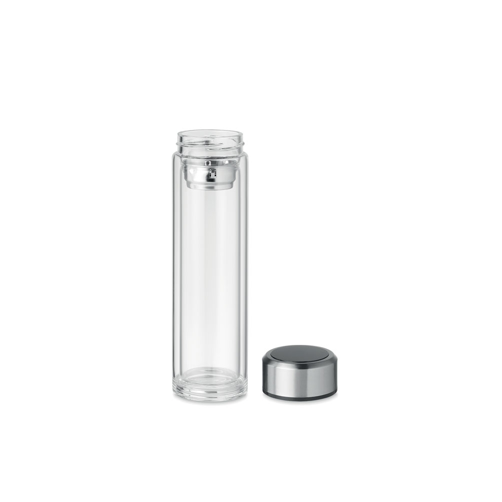 Doppelwandige Flasche aus Borosilikat-Glas. Mit Tee-Sieb. Im Deckel befindet sich eine integrierte Touchscreen LED Temperaturanzeige, die die Temperatur des Getränks anzeigt. Inkl. 1 austauschbare CR2032 - Batterie. Füllmenge: 390 ml. Auslaufsicher.