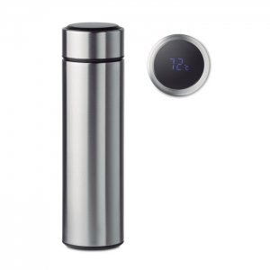 Doppelwandige Isolierflasche aus Edelstahl. Im Deckel befindet sich eine integrierte Touchscreen LED Temperaturanzeige. Inkl. 1 wiederaufladbare CR 2032-Batterie. Füllmenge: 500 ml. Auslaufsicher.