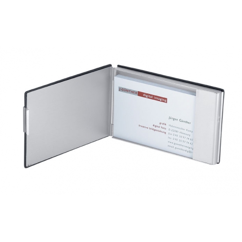 Mehr als ein Visitenkartenetui - die federleichte Box aus Metall ist aufstellbar und als Platzkarte oder Visitenkartenständer einsetzbar. Es finden, je nach Papierstärke bis zu 20 Visitenkarten Platz darin. Ihr Logo oder Grafik kann mit einer edlen Lasergravur oder einem bis zu zweifarbigen Tampondruck auf dem Etui platziert werden.