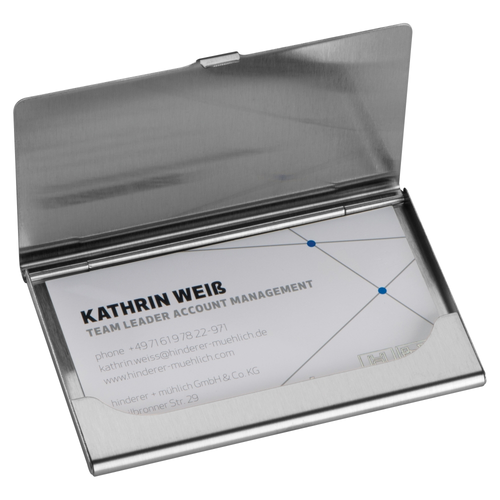 Artikel-Nr: 34250347-OEMehr als ein Visitenkartenetui - die federleichte Box aus Aluminium ist aufstellbar und als Platzkarte oder Visitenkartenständer verwendbar.