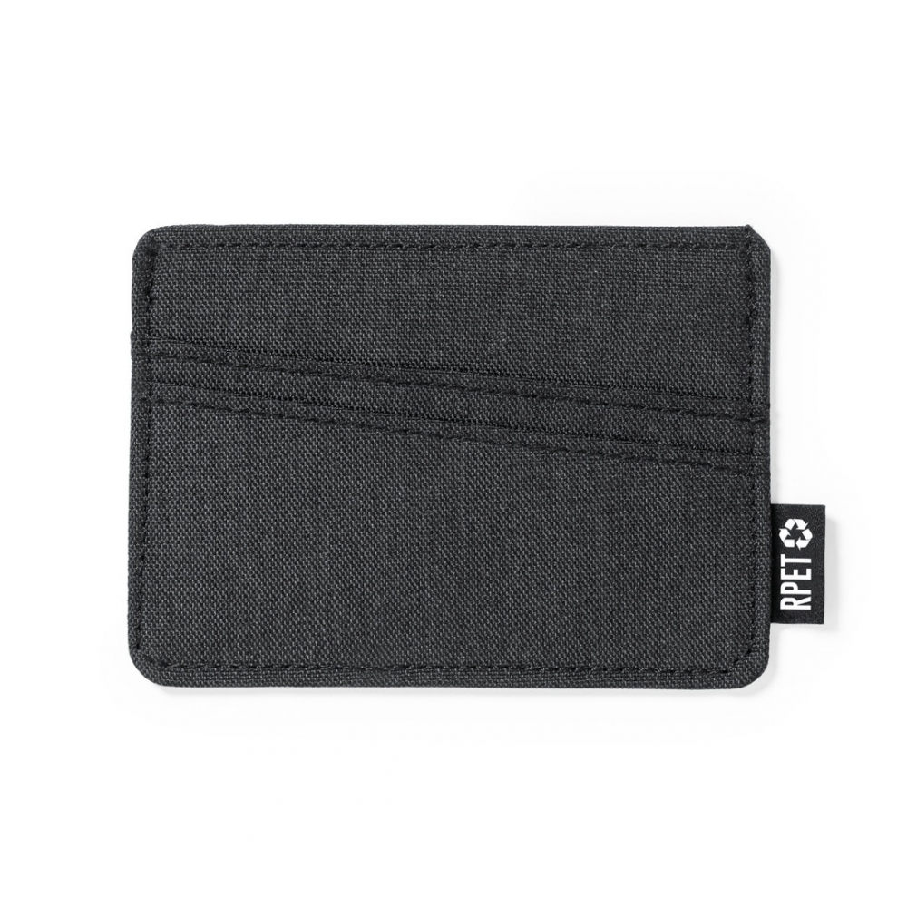 Elegant wallet and card holder made of RPET polyester with black finish. With magnet closure and capacity for 5 cards. Release mechanism by pulling the closure strap. RFID (Radio Frequency Identification) security technology that keeps card data safe. With the distinctive of RPET and RIFD outside. RPET material is made from recycled plastic, to encourage the reuse of plastic waste and help the sustainability of the planet.