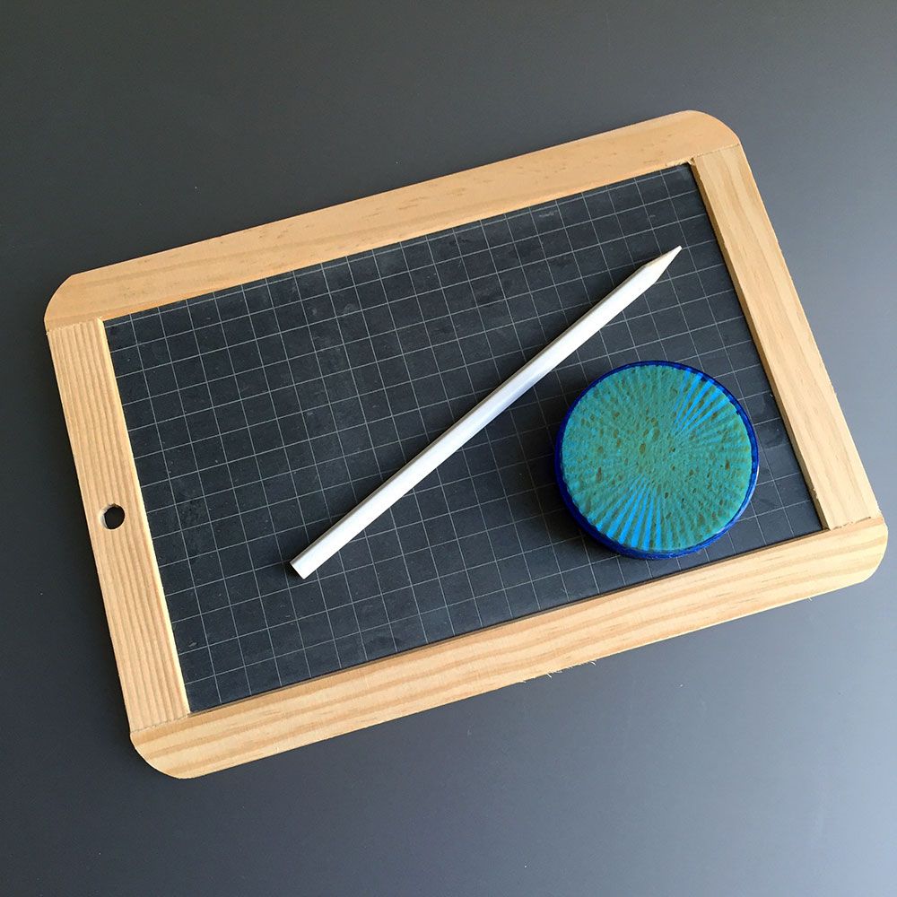 Schiefertafel aus Kunststoff mit Schwämmchen und Griffel