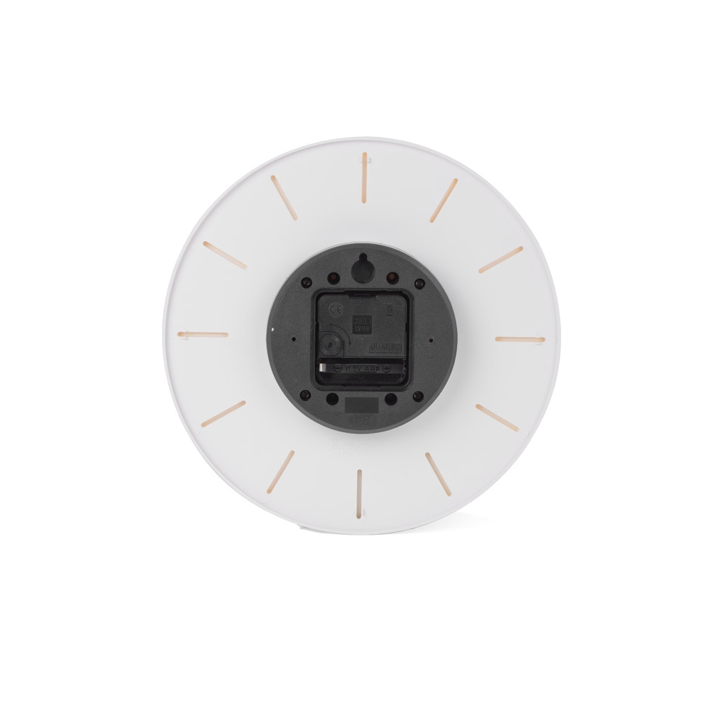 Wanduhr mit leuchtendem In-Mould-Labeling für eine außergewöhnliche Markenpräsenz. Das Zifferblatt besteht mindestens zu 97 % aus recycelten Materialien.