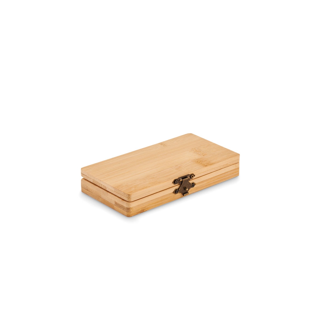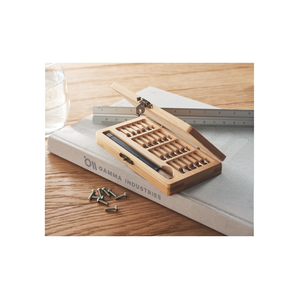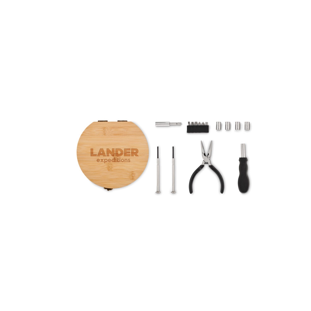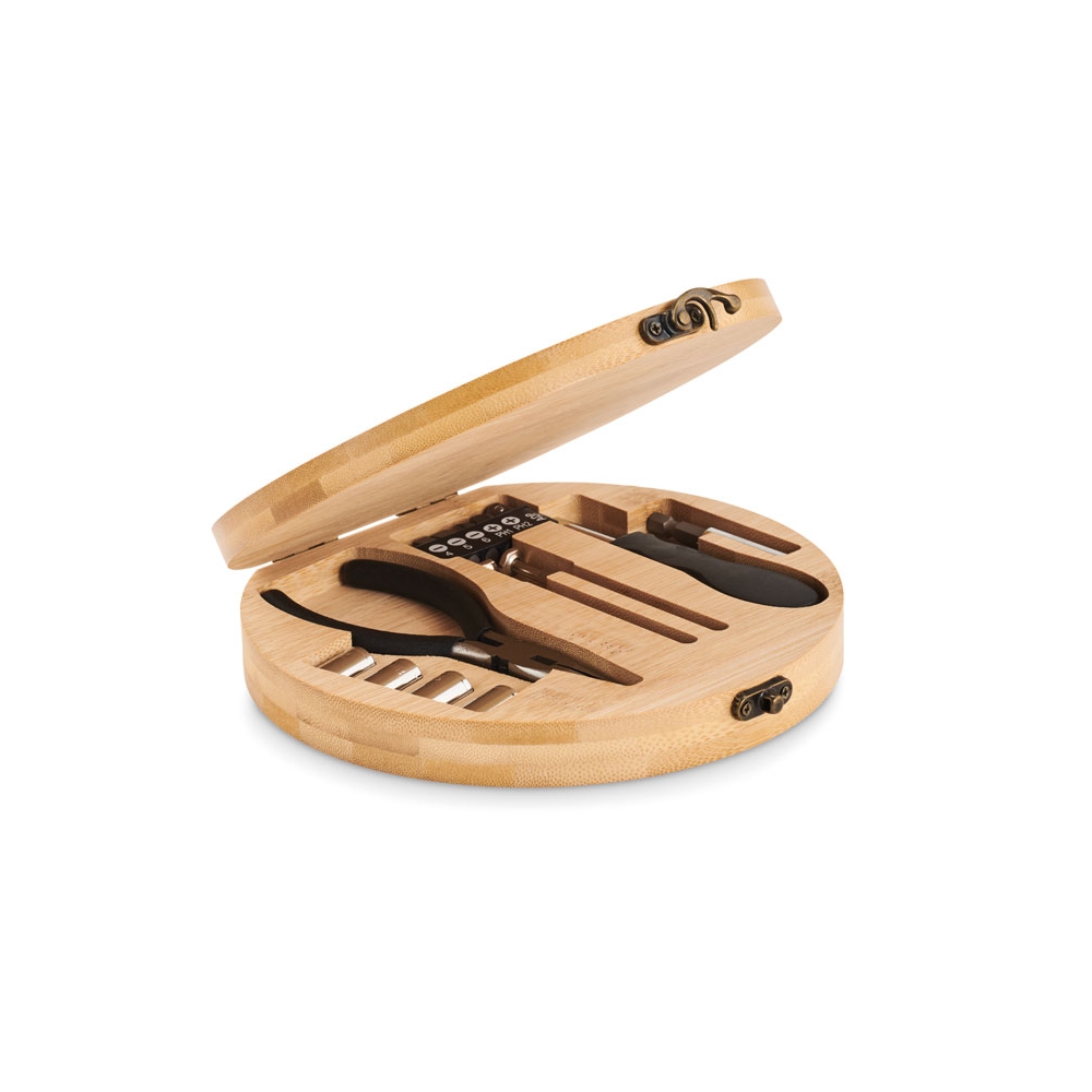 Artikel-Nr: KTO20483000000Werkzeugset in einer widerstandsfähigen Bambusbox mit Metallverschluss. Mit gestanzter Innenseite aus Bambus für eine perfekte Passform der Werkzeuge. Inklusive 15 Zubehörteilen: Steckschlüssel, Zange mit Schneidfunktion, Präzisionsschraubendreher (Flach- und Kreuzschlitz) und Schraubendreher mit einer Vielzahl an Schlitz-, Kreuz-, Sechskant- und Torx-Bits. Präsentiert in einer Kraft-Design-Box. Materialien wie Bambus fördern die Nutzung natürlicher Rohstoffe und reduzieren so den Schadstoffausstoß. Es stammt von einer äußerst widerstandsfähigen und vielseitigen Pflanze mit schnellem Wachstum und Regeneration, was es zu einer hervorr ...