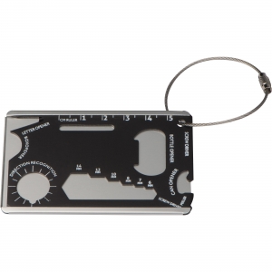 Survival Kofferanhänger aus Aluminium mit Brieföffner, Lineal, Flaschenöffner, Dosenöffner, Schraubenzieher, Kompass, Schraubenschlüssel und Sparschäler. Das ultimative Werkzeugset! Ihre Werbung wird auf den Anhänger gelasert.