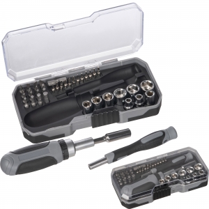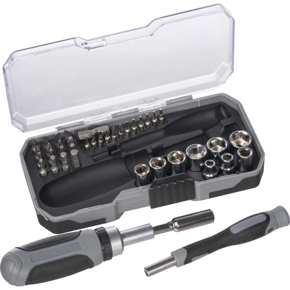 Werkzeugset bestehend aus diversen Schraubendrehern, einer Pinzette, zwei Zangen und einem Schraubendreher mit verschiedenen Nüssen und Bits. Ihre Werbung gravieren wir auf den Deckel des Werkzeugsets. Doming auf Anfrage.