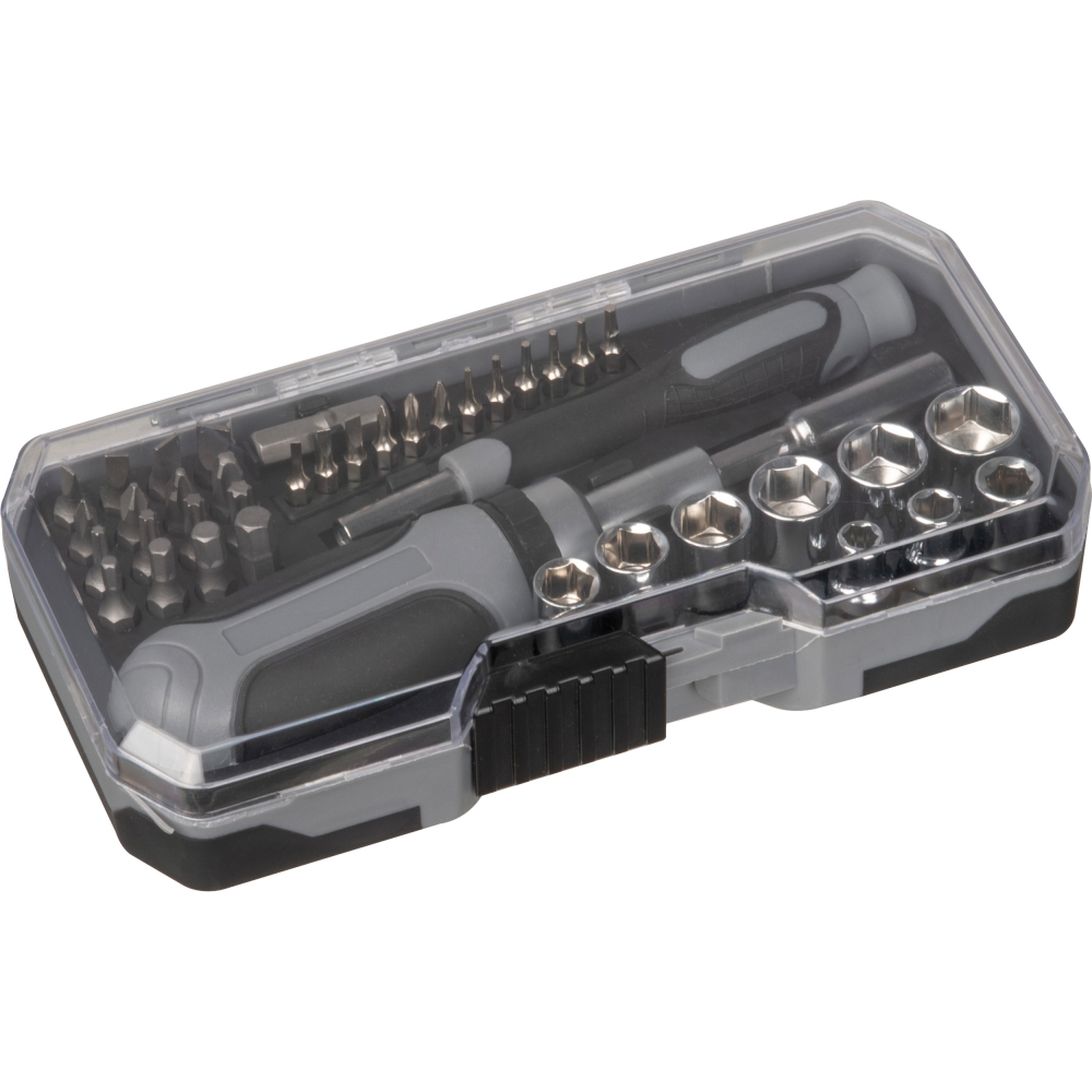 Umfassendes 41-teiliges Werkzeugset: 1 x 60-mm-Schraubendreheranschluss; 1 x Schraubendrehergriff; 1 x Ratschenschraubendreher; 1 x 24-mm-AD; 9 x 1/4-Zoll Steckschlüssel; 16 x 25-mm-Schraubendreherbits; 12 x 28-mm-Schraubendreherbits