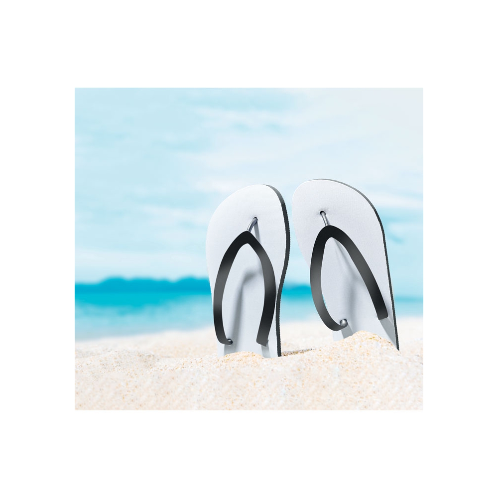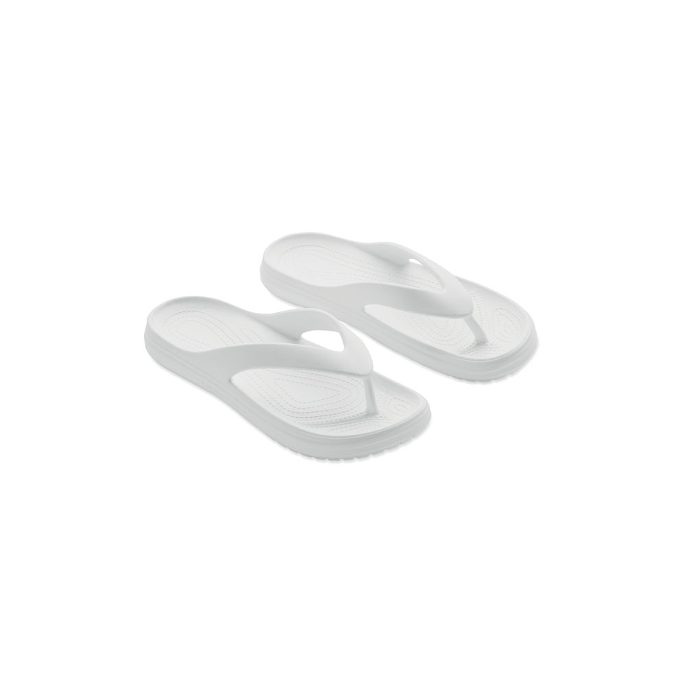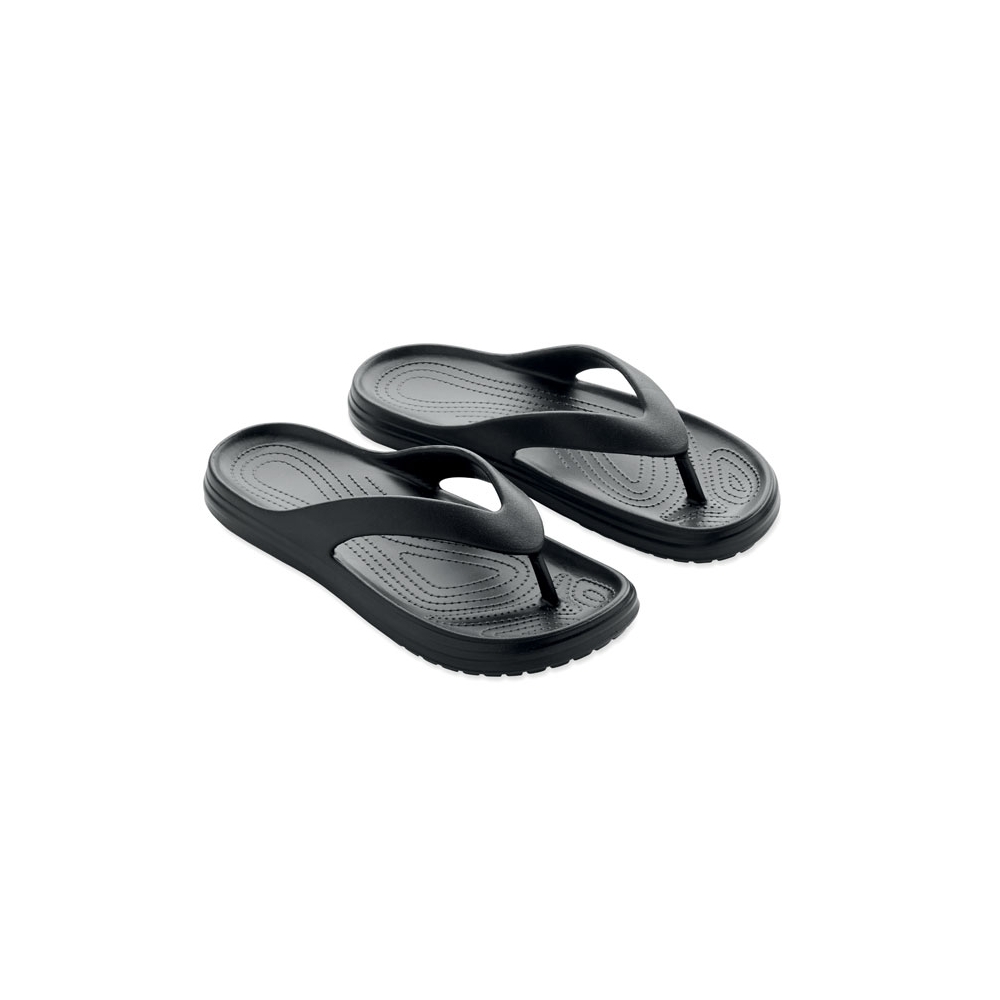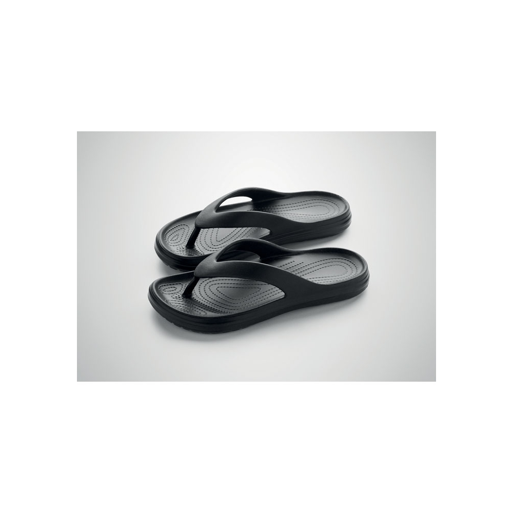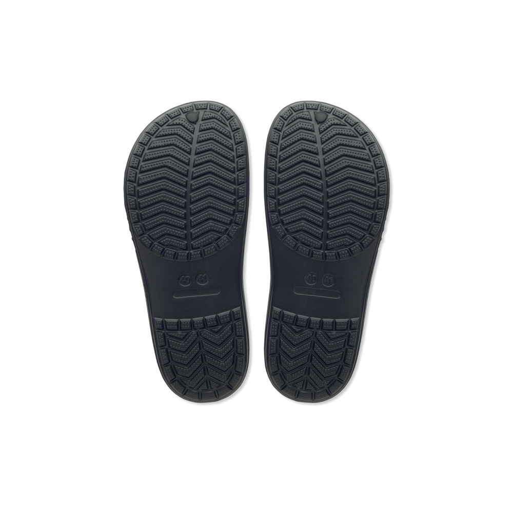 Artikel-Nr: KTO16441002010Ein Paar Zehensandalen, von der Natur inspiriert, mit einer Schuhoberfläche mit attraktivem, gedrucktem Kork-Effekt-Muster. Aus widerstandsfähigem EVA und farblich passenden PVC-Riemen. Erhältlich in den Größen 36-38 und 42-44.