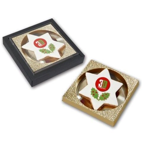 Zimtstern aus feinster Haselnuss-Mandel-Mischung mit Zuckerguss, in glänzend- oder matt-kaschiertem weißem Flowpack einzeln verpackt.