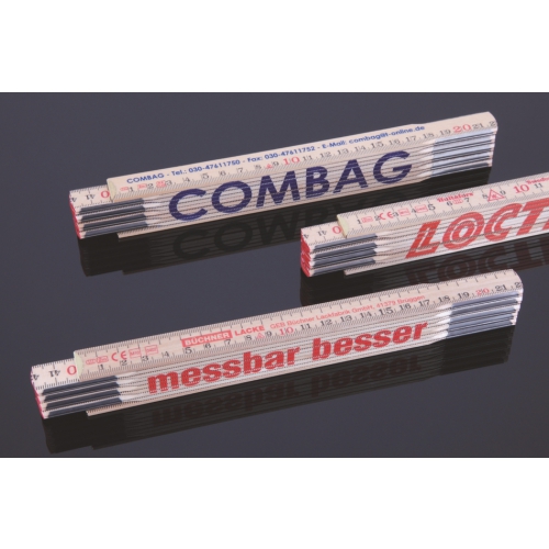 Außergewöhnliche Gliedermaßstäbe in sehr guter Qualität. Bündig aufeinander liegende Glieder mit innenliegenden Metallgelenken für anspruchsvolle Druckmotive und digitalem Druck. Dachneigungen etc. durch Winkelskala auf 2. Glied messbar.- Made in Germany -