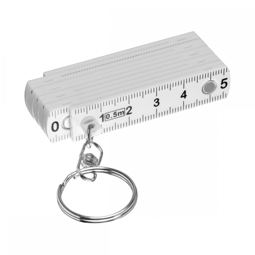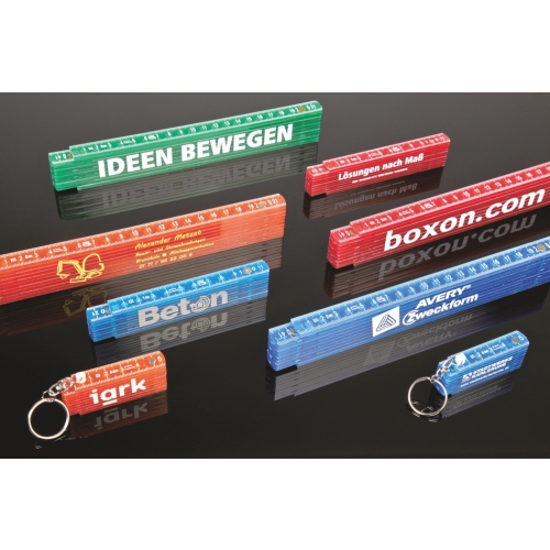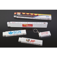 Schlüsselanhänger mit ausklappbarem Zollstock aus Kunststoff mit einem Messbereich bis zu 0,5 Meter (Skalierung in cm). Ihre Werbung wird auf die freie Seitenfläche des Zollstocks gedruckt.