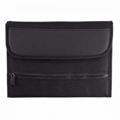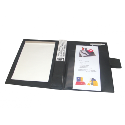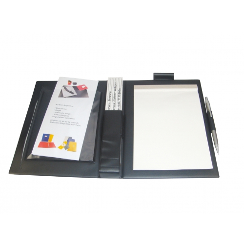 Handwerkermappe DIN A5, innen links 1 Einsteckschlitz für Buchkalender, mittig im Rücken Einsteckmöglichkeit für Zollstock, innen rechts: 1 Schlitz für DIN A5-Block, darüber 1 Stifteschlaufe, Verschlusslasche mit Klettstreifen, passend für DIN A5, Kunstleder, schwarz (bzw. Standardfarben)