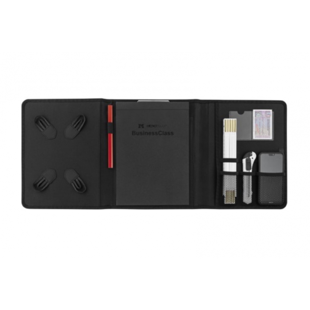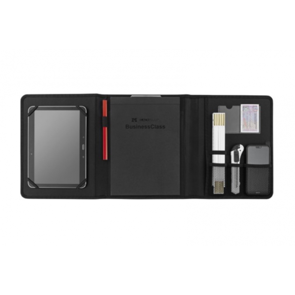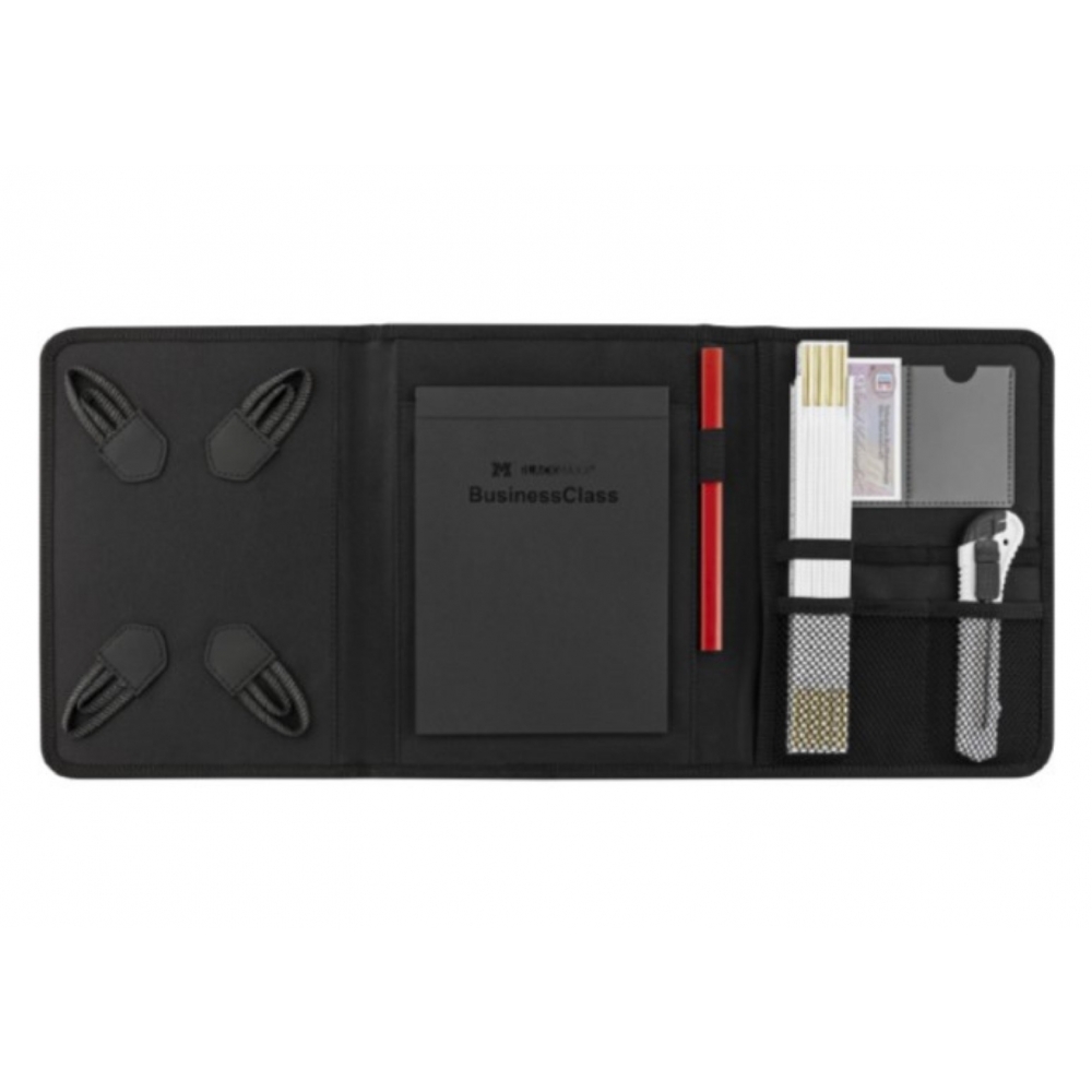 Moderne Handwerkermappe mit umfangreicher Ausstattung wie dem Padhalter. A4 Format, für 10,1 und 7 inch Pads, VPE 15. Klemmblockleiste, Block, Zollstockhalter, Cutter Tasche, Kuli Halter, Handytasche, Designkarton