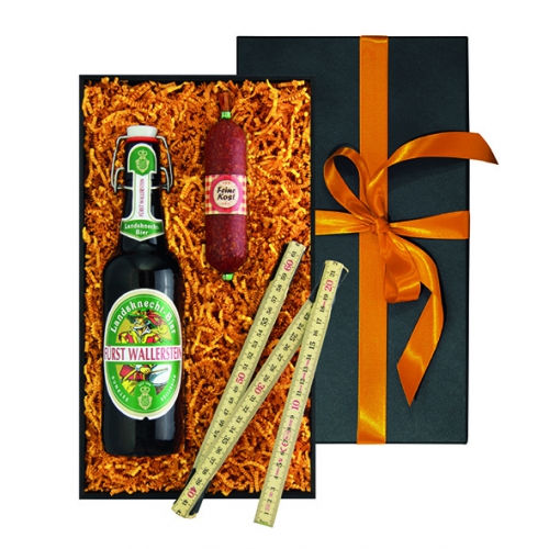 1 Flasche köstliches Fürst Wallerstein Bier Ein Spitzenbier mit beeindruckendem Geschmack, 0,5 l. 1 Feine-Kost Salami Erstklassige Qualität, 100 g. 1 praktischer Holz-Gliedermaßstab 2 Meter Maßarbeit Geschenk- / Präsentset für Ihre Kunden zu Weihnachten.