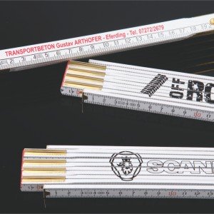 Hochwertige Zollstöcke oder Gliedermaßstäbe sind von Hobby- und Profil-Handwerkern gleichermaßen sehr geschätzt. Mit einer Werbeanbringung versehen, ist ein Zollstock ein wertvoller Langzeit-Werbeartikel. Schauen Sie sich in unserem großen Sortiment um! Wir liefern Ihnen alle Arten und Längen von Zollstöcken oder Gliedermaßstäben mit Ihrer Werbung. Mit unserer Best-Preis-Garantie erhalten Sie immer den allerbesten Preis!