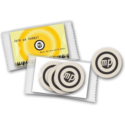 Verpackung: 2 Oblaten im Flow-Pack mit einer individuell bedruckten Werbekarte