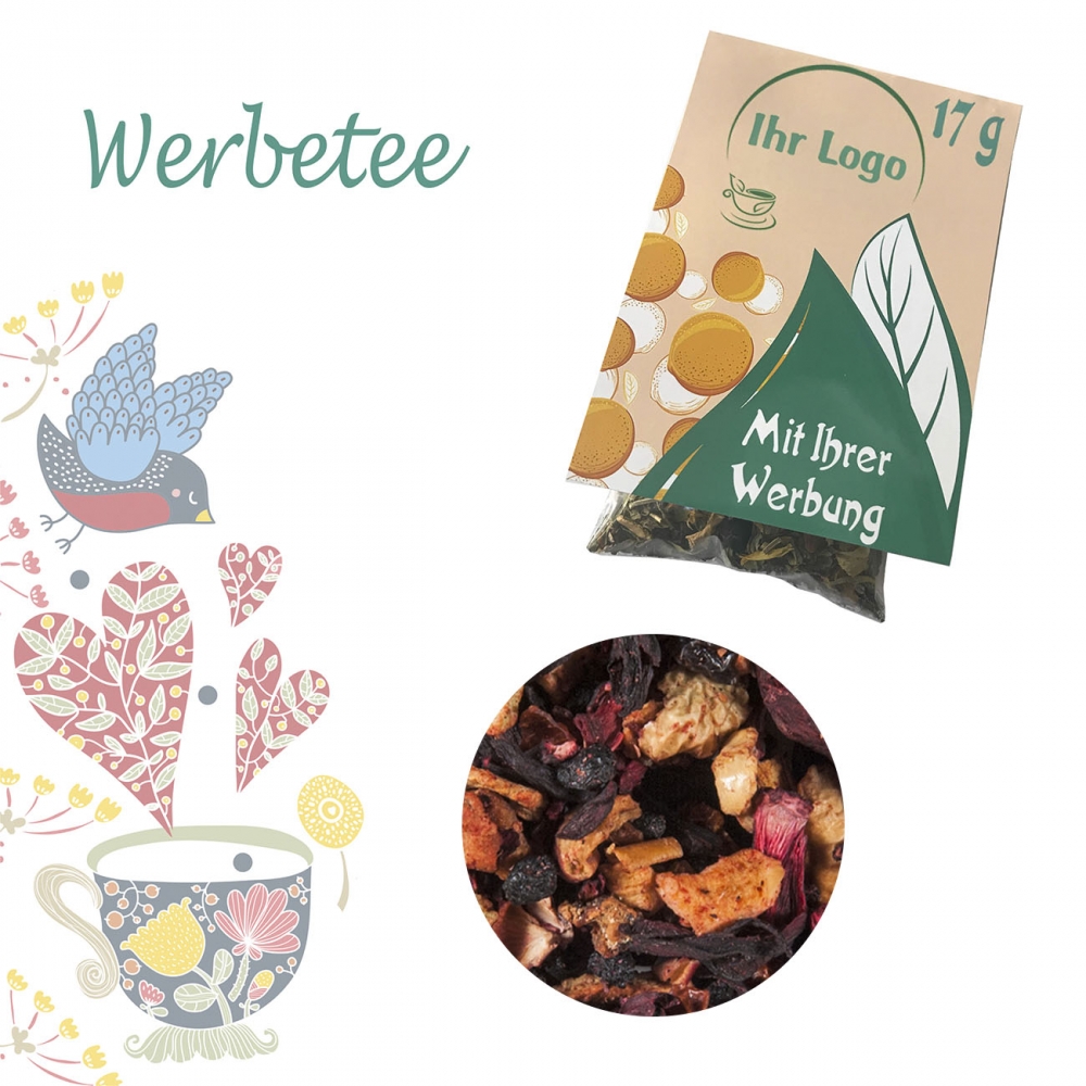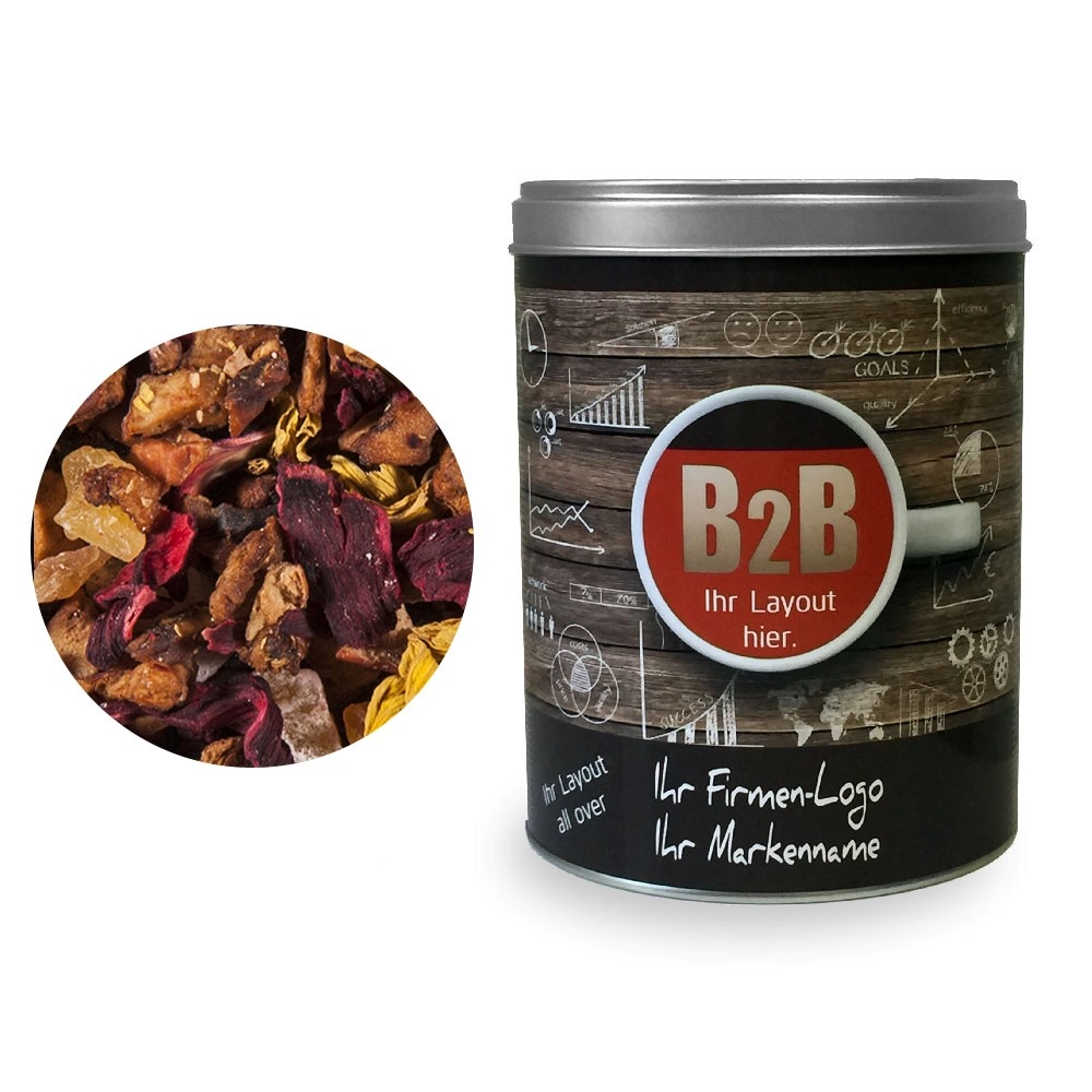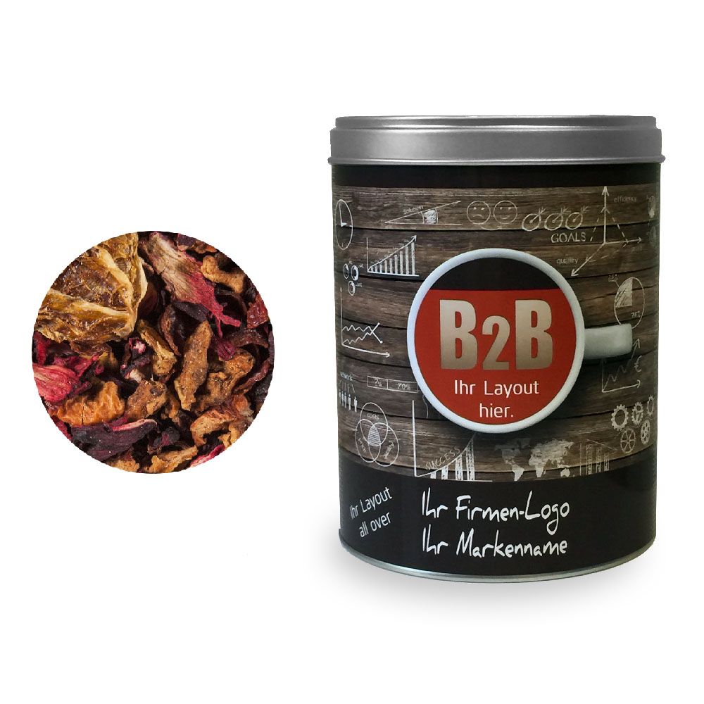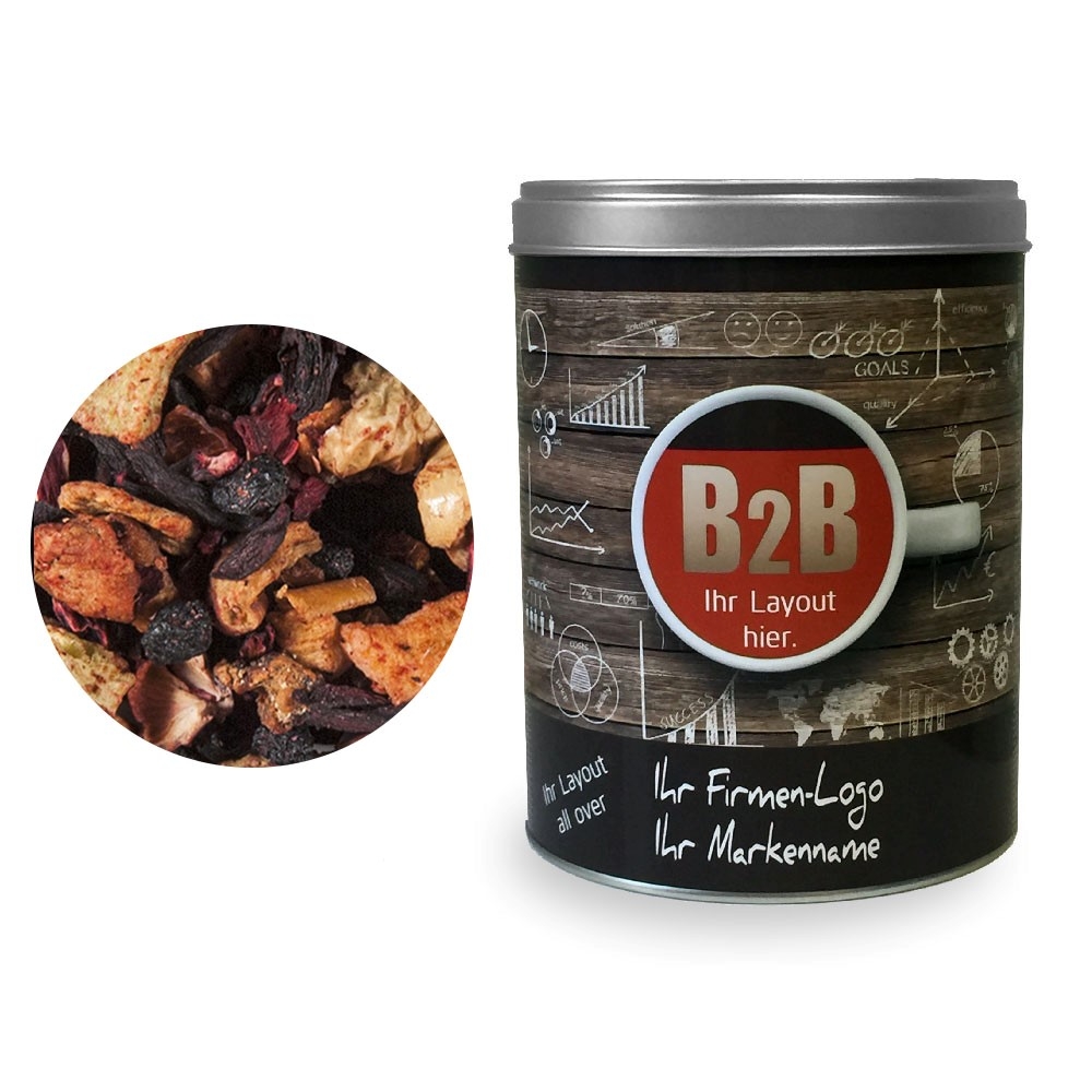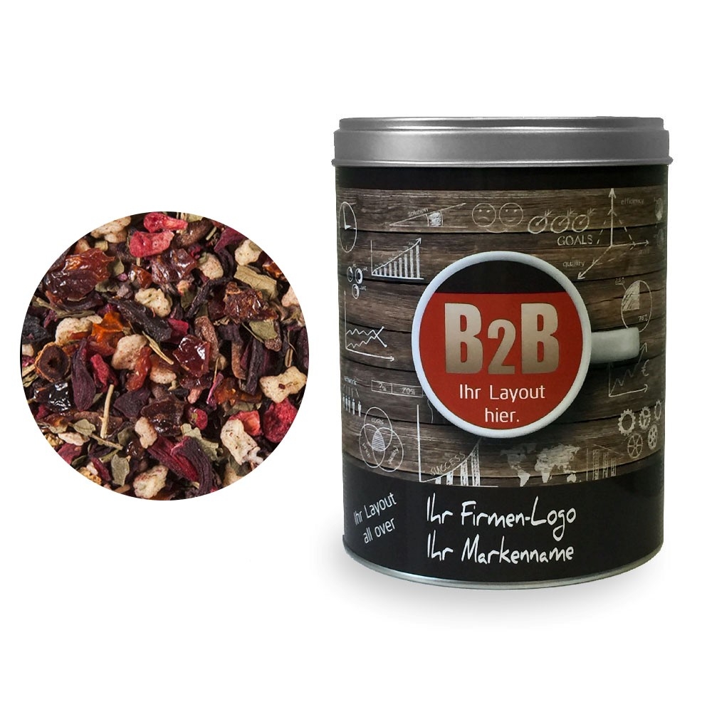 Zutaten: Hibiskusblüten, Apfelstücke, Papayastücke (Papaya, Zucker) (19 %), Korinthen, Holunderbeeren, Schwarze Johannisbeeren, Aromen, Sonnenblumenblüten, Himbeerstücke, Erdbeerstücke, Kornblumenblüten