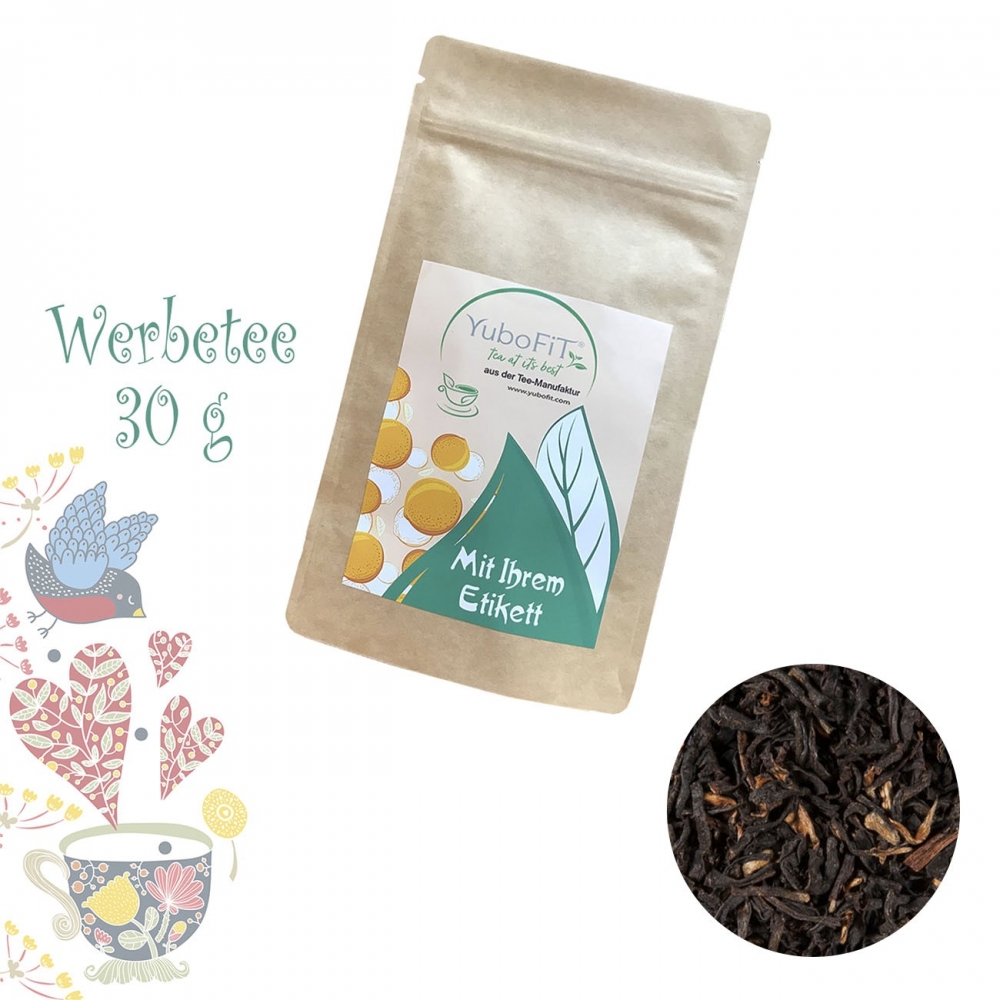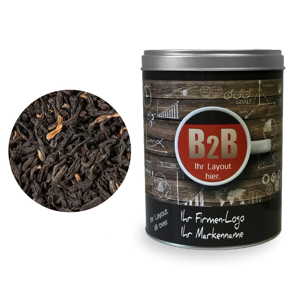 Artikel-Nr: HLSD150105354Tee als Werbegeschenk aus der YuboFiT® Tee Manufaktur. Kräftig, aromatisch und sehr gehaltvoll mit dunkler Tasse und intensiver Würze. Fein gearbeitetes Goldspitzenblatt. Besonders schön entfaltet sich dieser Tee mit einer Spur Süße und/oder einem Schlückchen Sahne.