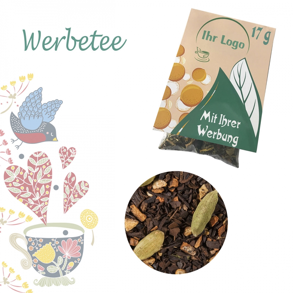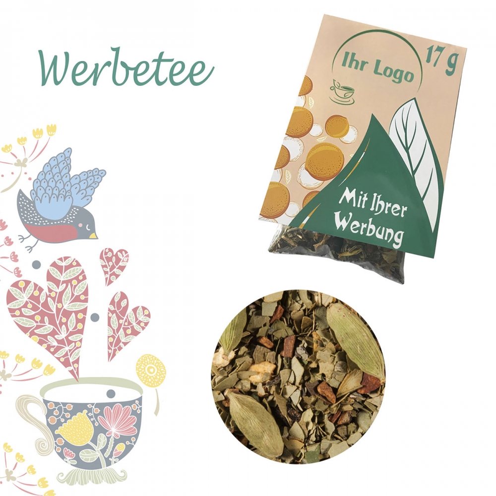 Artikel-Nr: FNM01792Faltschachtel. Werbeanbringung als Direktdruck in 4c individuell bedruckbar. Zutaten Bio Beuteltee Oriental Chai: Zimt (40%)*. Zichorienwurzel*, Ingwer (10%)*, Kardamom (9%)*, Süßholz*, Gewürznelken*, Sternanis*, schwarzer Pfeffer*, Steviablätter* - *aus kontrolliert biologischem Anbau.