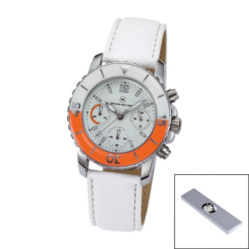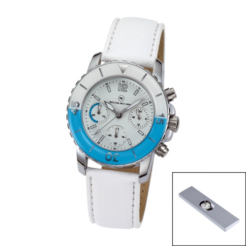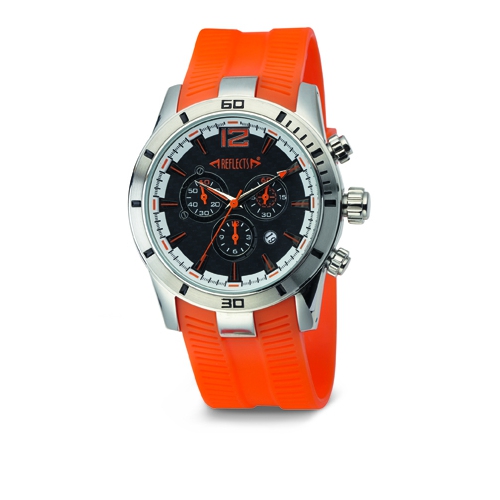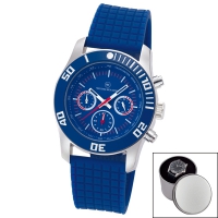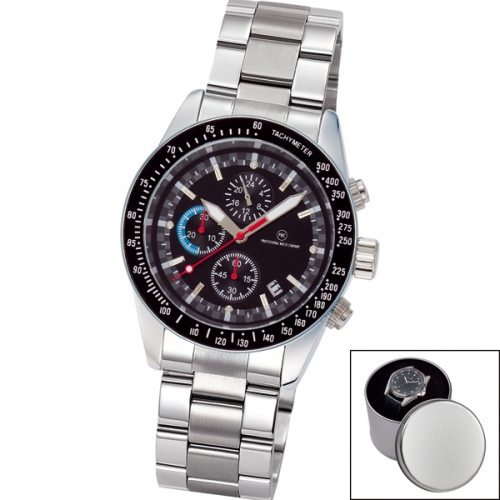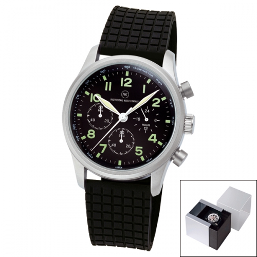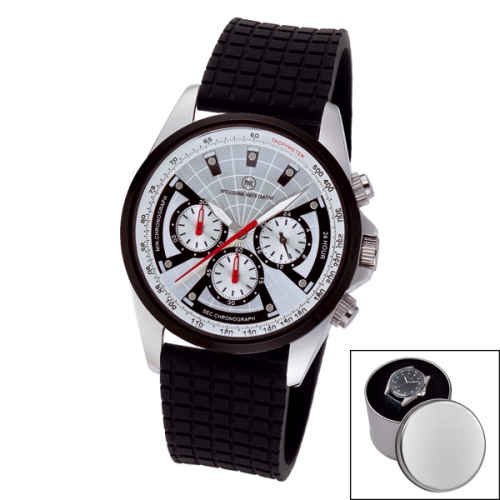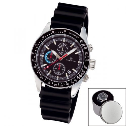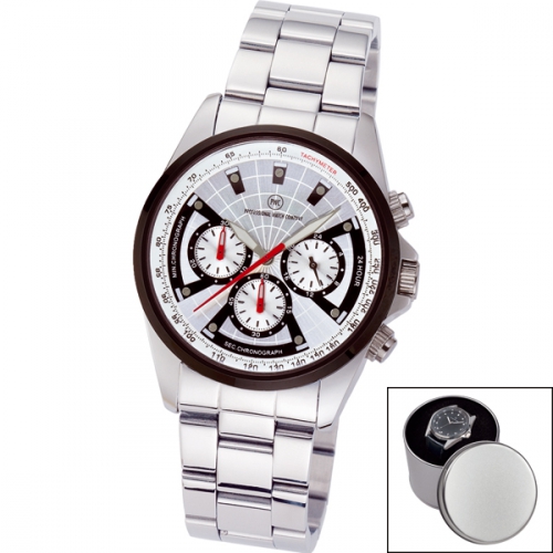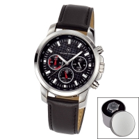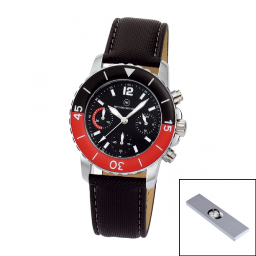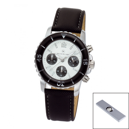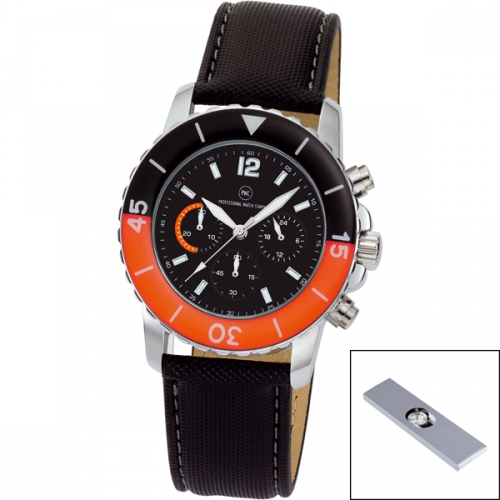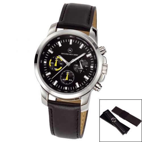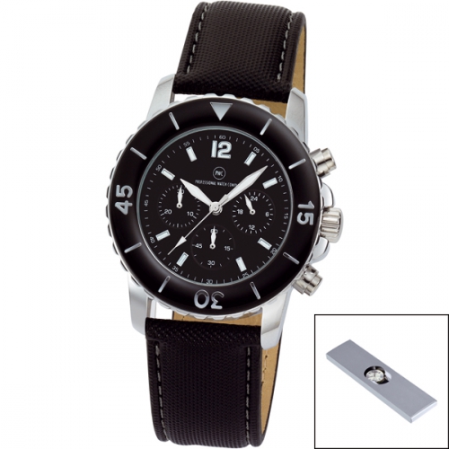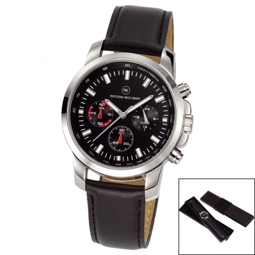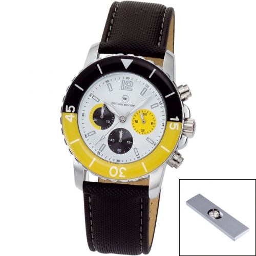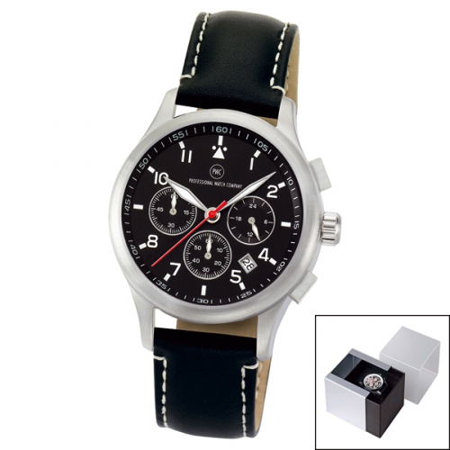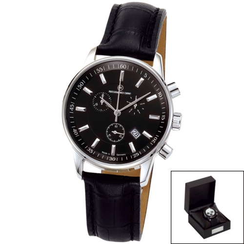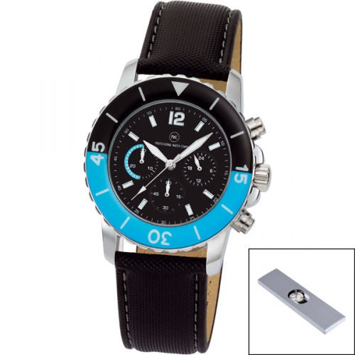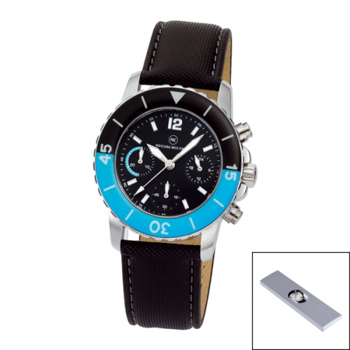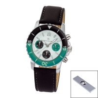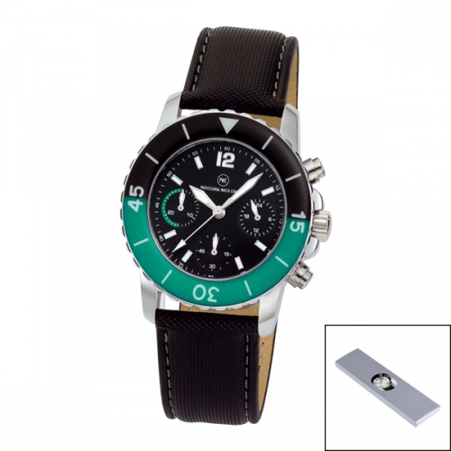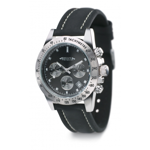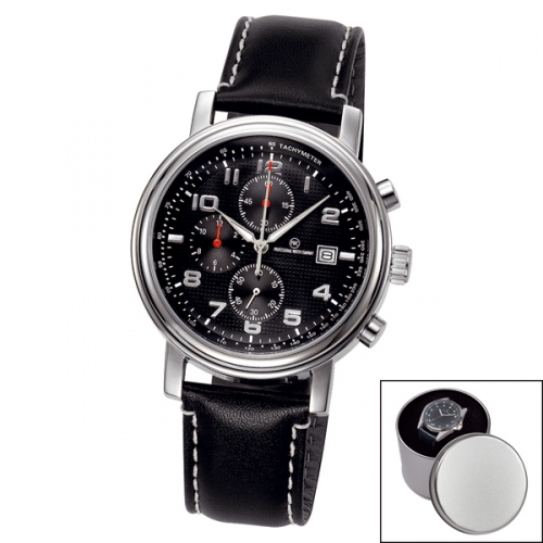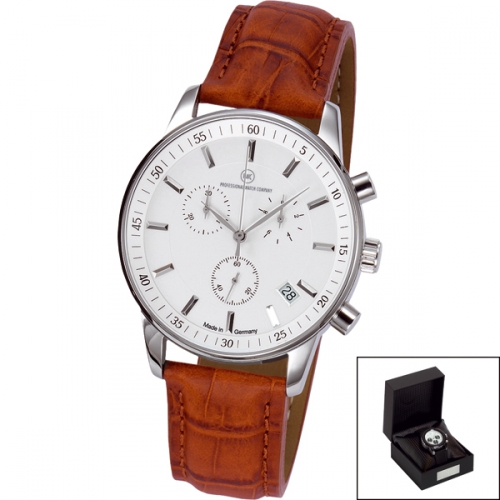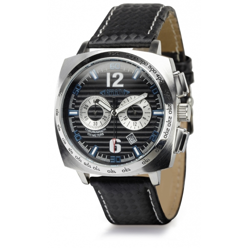Artikel-Nr: 34270131• Metallgehäuse mit 6 Schrauben und feststehender Lünette • Uhrwerk mit Chronograph 1/1 Sek. • gedrucktes und Sunray-Ziffernblatt • aufgeklebt, erhabener und gedruckter Index • aufgeklebt, erhabenes Logo • Lederarmband in Kroko-Optik • wasserdicht 3 ATM