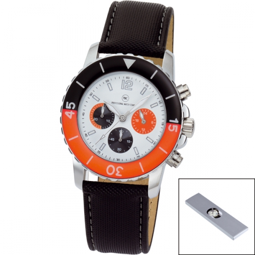 Artikel-Nr: 57321910WS-GRChronograph mit Metallgehäuse glänzend mit hochwertiger IP-Beschichtung, drehbare Lünette und Kronenschutz, wasserdicht 3 bar, sportliches, robustes Nylon-Armband mit Edelstahl-Dornschließe, gehärtetes Mineralglas, Zeiger und Stundenindex fluoreszierend, Markenuhrwerk JS20 von Miyota (by CITIZEN) mit 24-Stunden-Anzeige, 5 Jahre Garantie, Kartonverpackung inkl.
