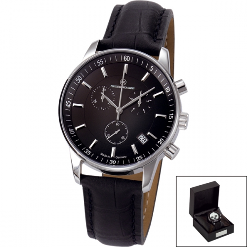 Metallgehäuse mit 6 Schrauben und feststehender Lünette Uhrwerk (OS20) mit Chronograph 1/1 Sek. gedrucktes und Sunray-Ziffernblatt aufgeklebt, erhabener und gedruckter Index aufgeklebt, erhabenes Logo Lederarmband in Kroko-Optik wasserdicht