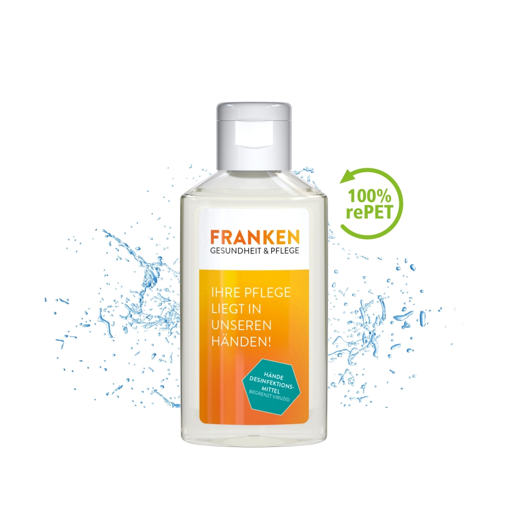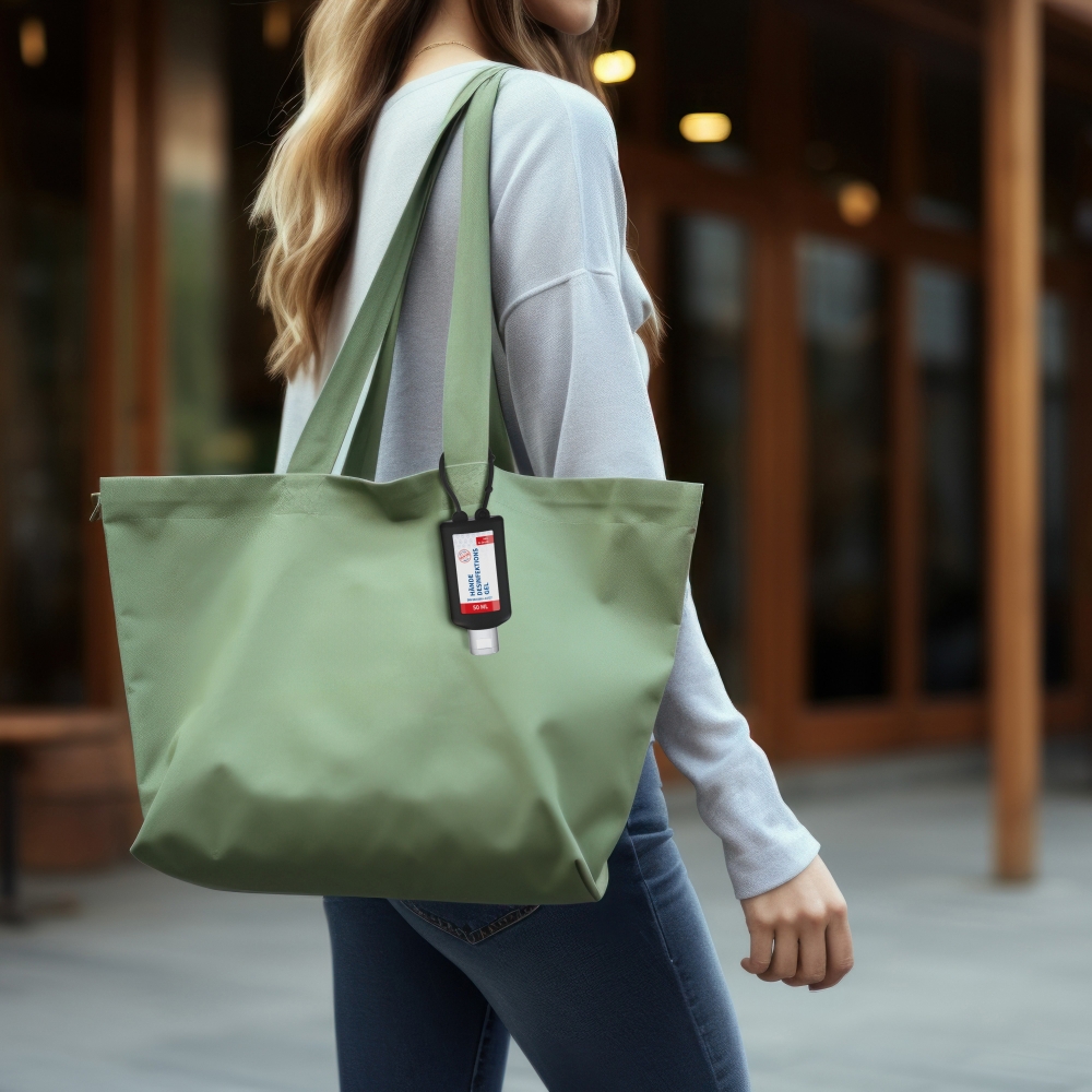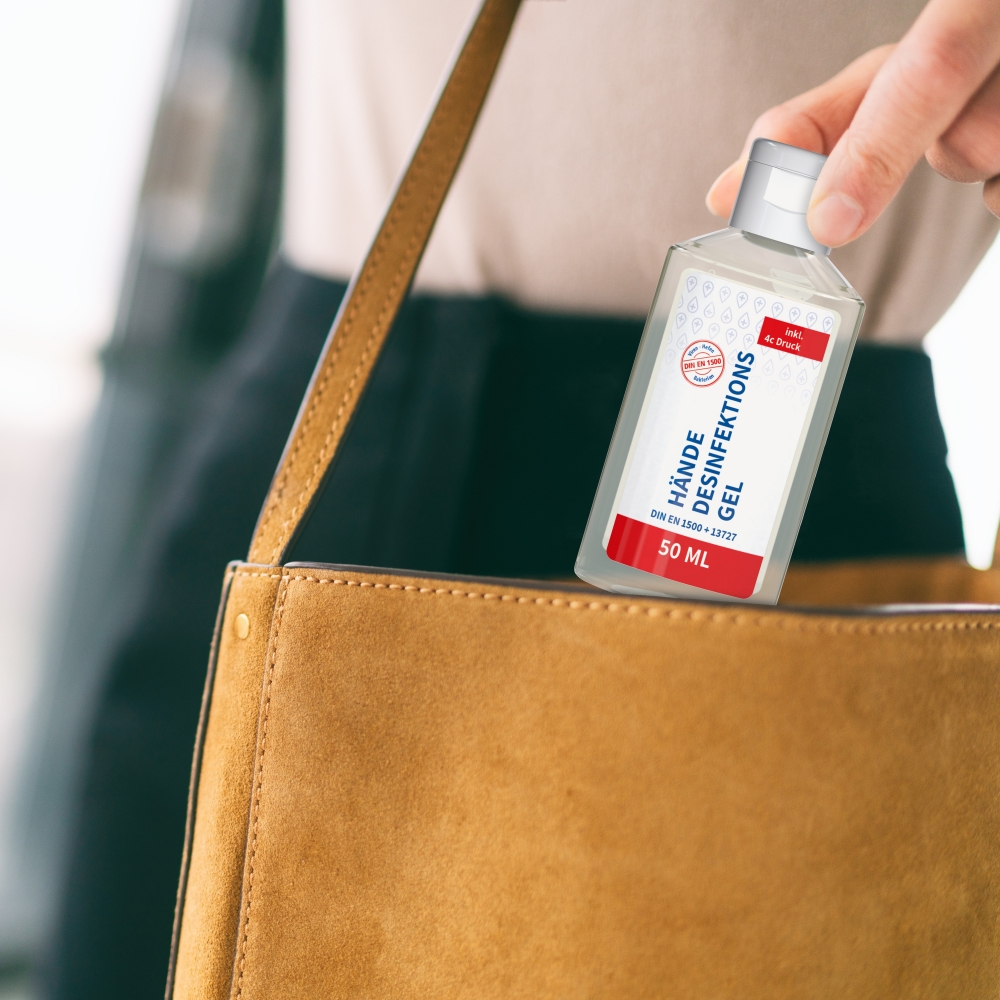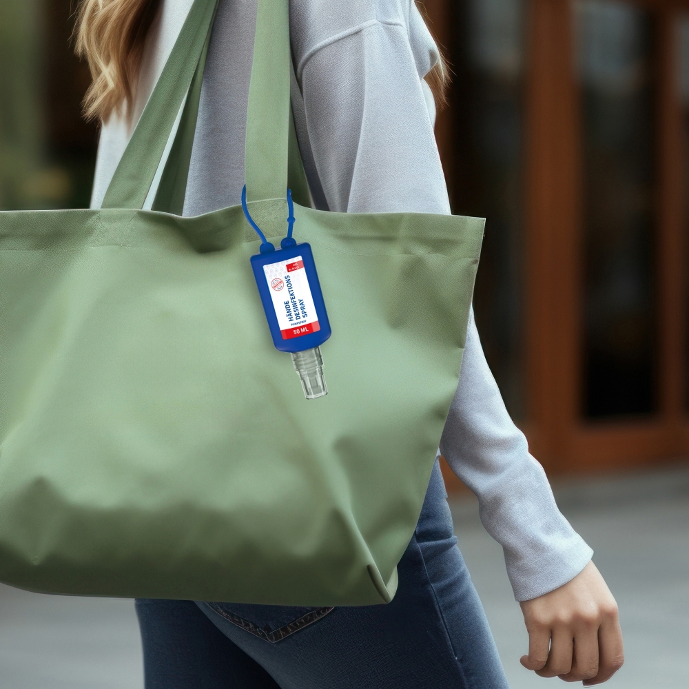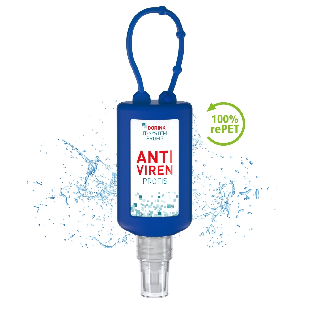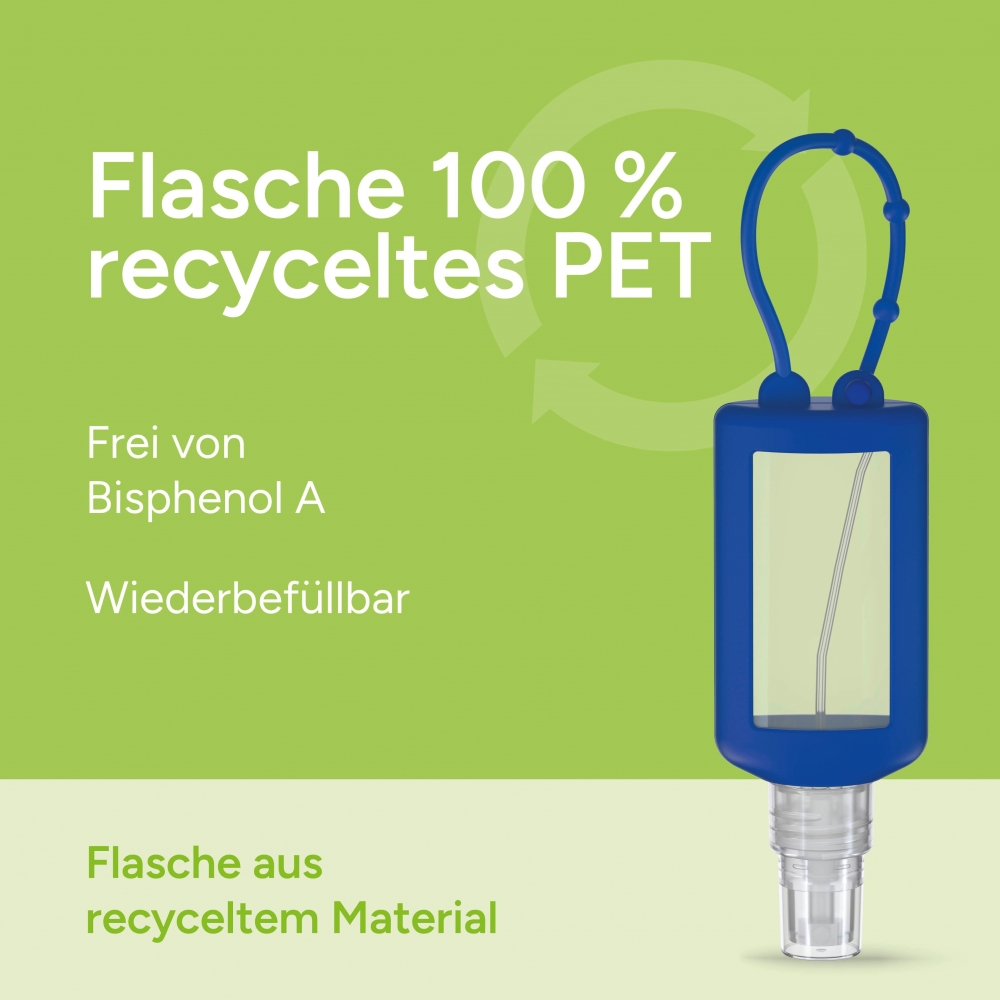 Artikel-Nr: SAN20-311-263-100Praktische Flasche zum Anhängen! Das Fläschchen mit Silikonhülle ist nicht nur optisch ein echter, Raffiniert mit Schlaufe zum Anhängen ans Handgepäck, an den Rucksack oder an den Kinderwagen. 50 ml Flasche aus 100% recyceltem PET, transparent mit leichter mit Pumpaufsatz "transparent" mit Schutzkappe; Silikonhülle und Schlaufe in Nachfüllbar. Dekoration: Body Label: Etikett PE (weiß) auf Vorder- und Rückseite, Druck 4c CMYK. Wahlweise glänzend oder matt. Das alkoholische Hände-Desinfektionsspmittel verfügt aufgrund seiner Zusammensetzung über ein breites Wirkspekt ...
