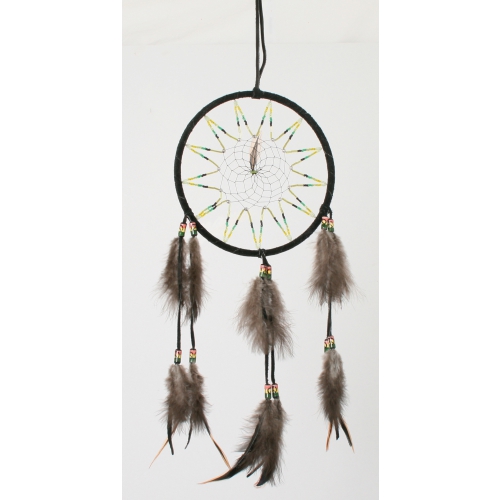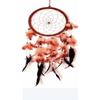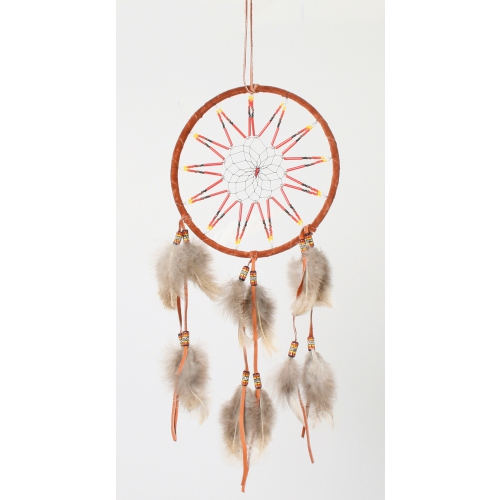 Artikel-Nr: P712Dekoratives Windspiel und hübscher Wandbehang für drinnen. Nach Überlieferung der amerikanischen Ureinwohner, zaubert der Dreamcatcher, über das Bett gehängt, schlechte Träume weg und schöne herbei. Aus Leder mit echten Federn.