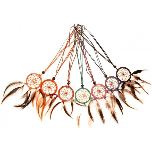 Artikel-Nr: 375107725Dekoratives Windspiel und trendiger Wandbehang für drinnen. Nach Überlieferung der amerikanischen Ureinwohner, zaubert der Traumfänger, über das Bett gehängt, schlechte Träume weg und schöne herbei. Aus Leder mit echten Federn. Länge: 20 cm. Verschiedene Farben sortiert.