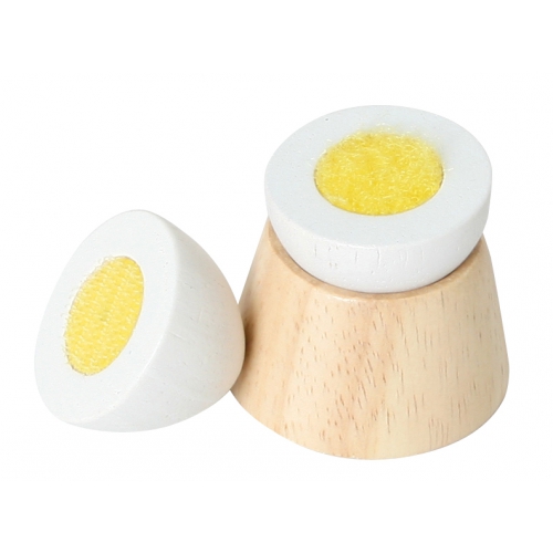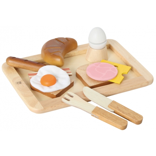 Inhalt: Teller, Messer, Gabel, Brot, Croissant, Käse, Schinken, Speck, Würstchen, Spiegelei, gekochtes Ei im Eierbecher. Jedes Ei besteht aus zwei Teilen. Diese haften dank Klettverschluss aneinander. Alles aus Gummibaumholz. Ab 3 Jahren. Achtung! Nicht geeignet für Kinder unter 36 Monaten.