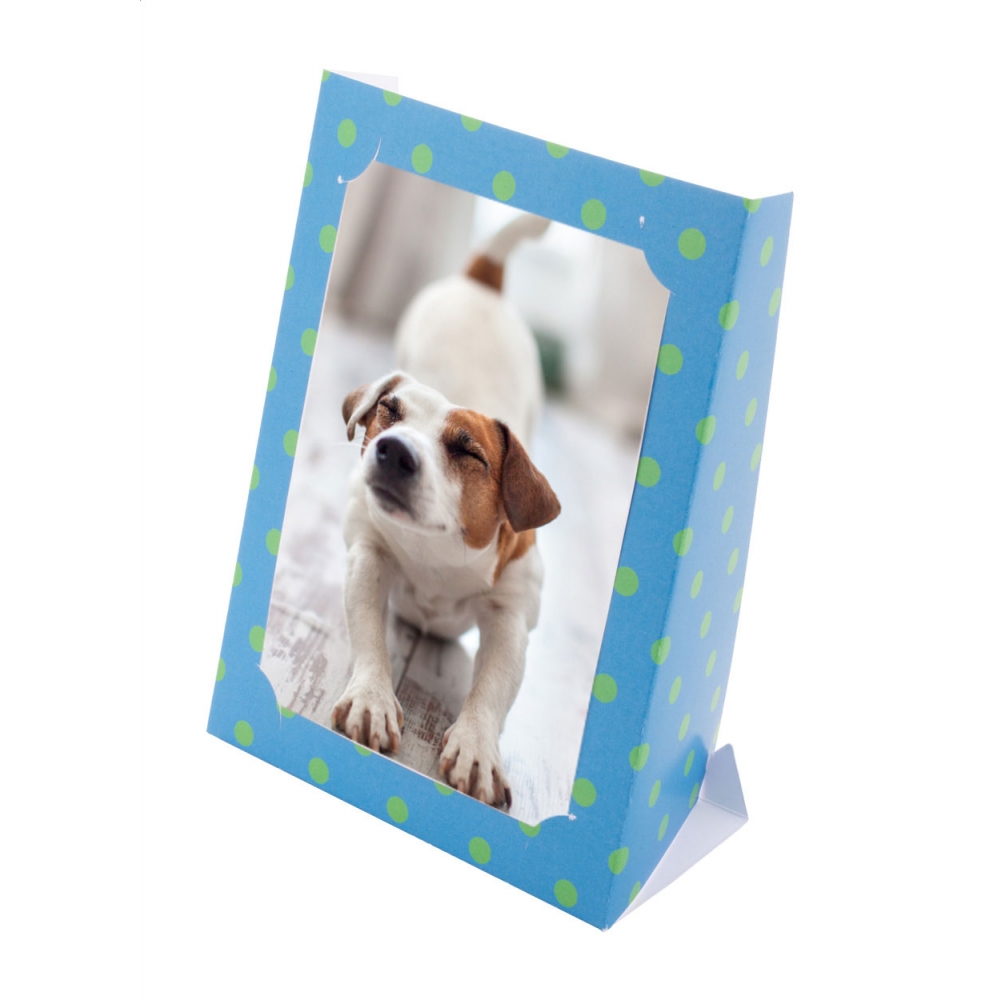 Individueller Fotorahmen aus Pappe für Fotos von 10 x 15cm. Der Preis ist inklusive einer vollfarbigen Bedruckung auf der Vorderseite. Mindestmenge: 100 Stk.