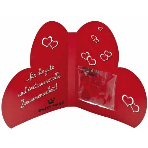 Das Flowpack in weißer oder transparenter Folie, beinhaltet 1 Herz-Bonbon, Pro Kilo ca, 312 Bonbons, in Kirschgeschmack, Die Folie ist rundum bedruckt, Lieferzeit ca, 3 Wochen nach Freigabe, Haltbarkeit 18 Monate inkl. 1-farbiger Druck, zzgl. Drucknebenkosten