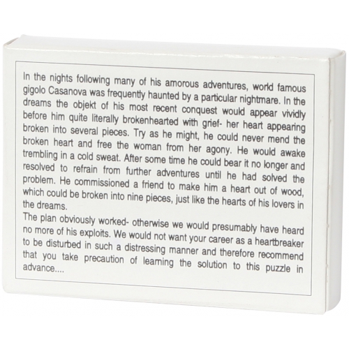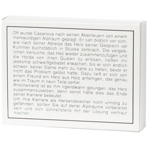Casanovas neunteiliges Lieblingspuzzle ist Herausforderung für jeden Herzensbrecher: Das Herz seiner Gespielinnen zu flicken, wenn es mal bricht! Auch in englischer Version erhältlich: Art.-Nr. 102528. Achtung! Nicht geeignet für Kinder unter 36 Monaten.
