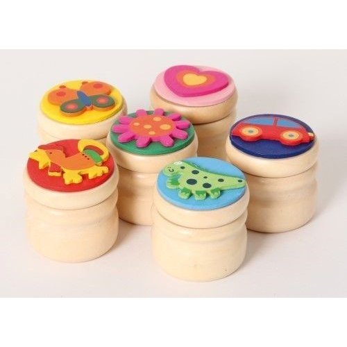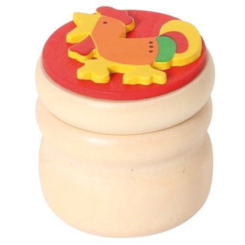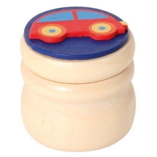 Fröhlich-bunte Holzdöschen für Milchzähne oder andere kleine Schätze. 6 Motive: Dino, Auto, Herz, Blume, Hahn und Schmetterling. Achtung! Nicht geeignet für Kinder unter 36 Monaten.