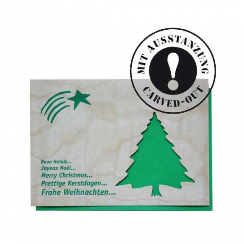 Lasergeschnittene Weihnachtskarte aus Holz. Wir richten uns in Größe und Motiv nach Ihren Wünschen. Fragen Sie einfach bei uns an.