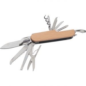 Artikel-Nr: MCM8141901Hochwertiges Multifunktionswerkzeug aus Edelstahl mit Holzschalen. Zange, Messer, Säge, Schere, Schraubendreher etc. Wir lasern Ihr Logo auf eine Seite des Griffes.