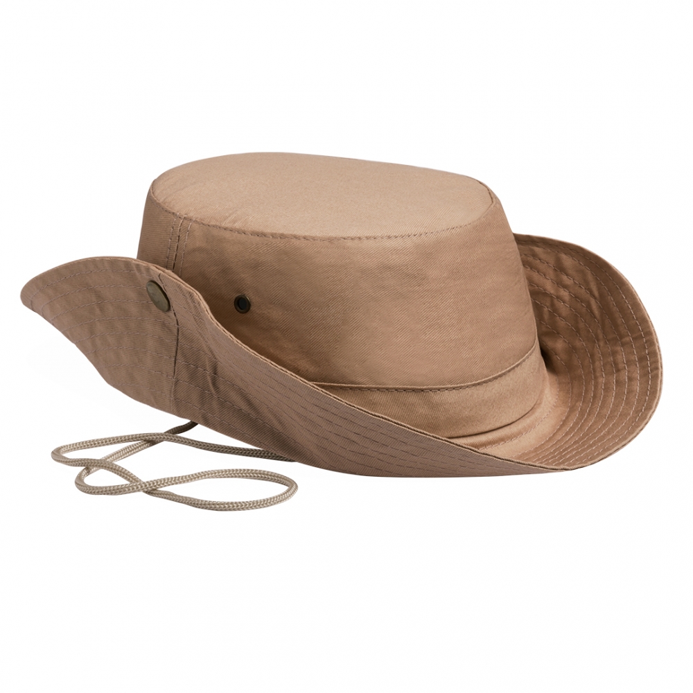 Safarihut aus Baumwolle. Angenehm zu tragen und mit seitlichen Belüftungsöffnungen, verstärkt mit Metallösen. Mit verstellbarer Krempe mit Druckknöpfen sowie farblich passendem Hutband.