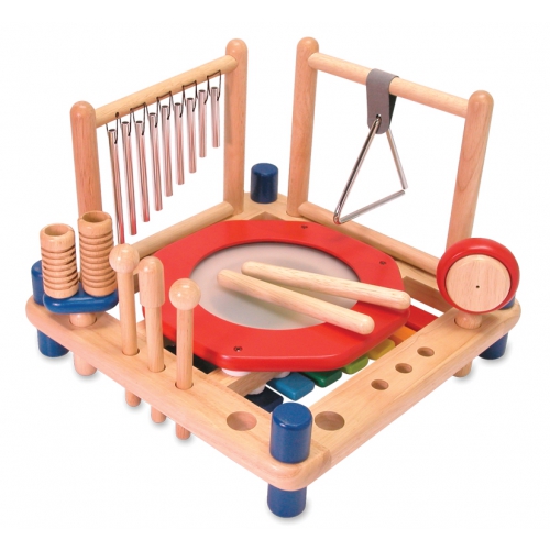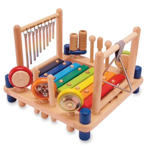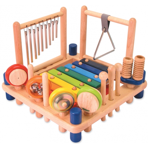 Die Spielstation aus Holz präsentiert zehn Musikinstrumenten: Xylophon, Trommel, Klangspiel, Triangel, Mini-Zimbel, Glocken, Marracas, Kastagnetten, Schellenkranz, ein paar Rhythmusstäbe, zwei Schläger und ein Scraper. Ab 3 Jahren. Achtung! Nicht geeignet für Kinder unter 36 Monaten.