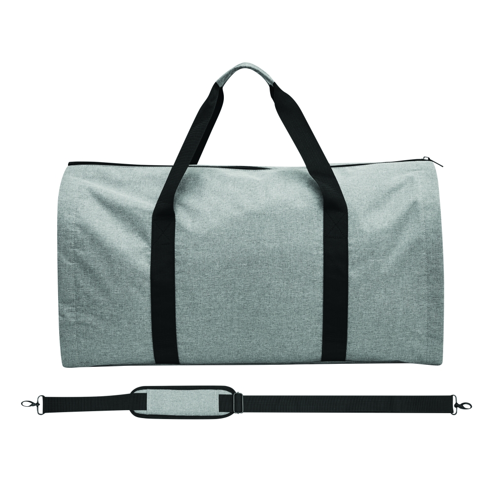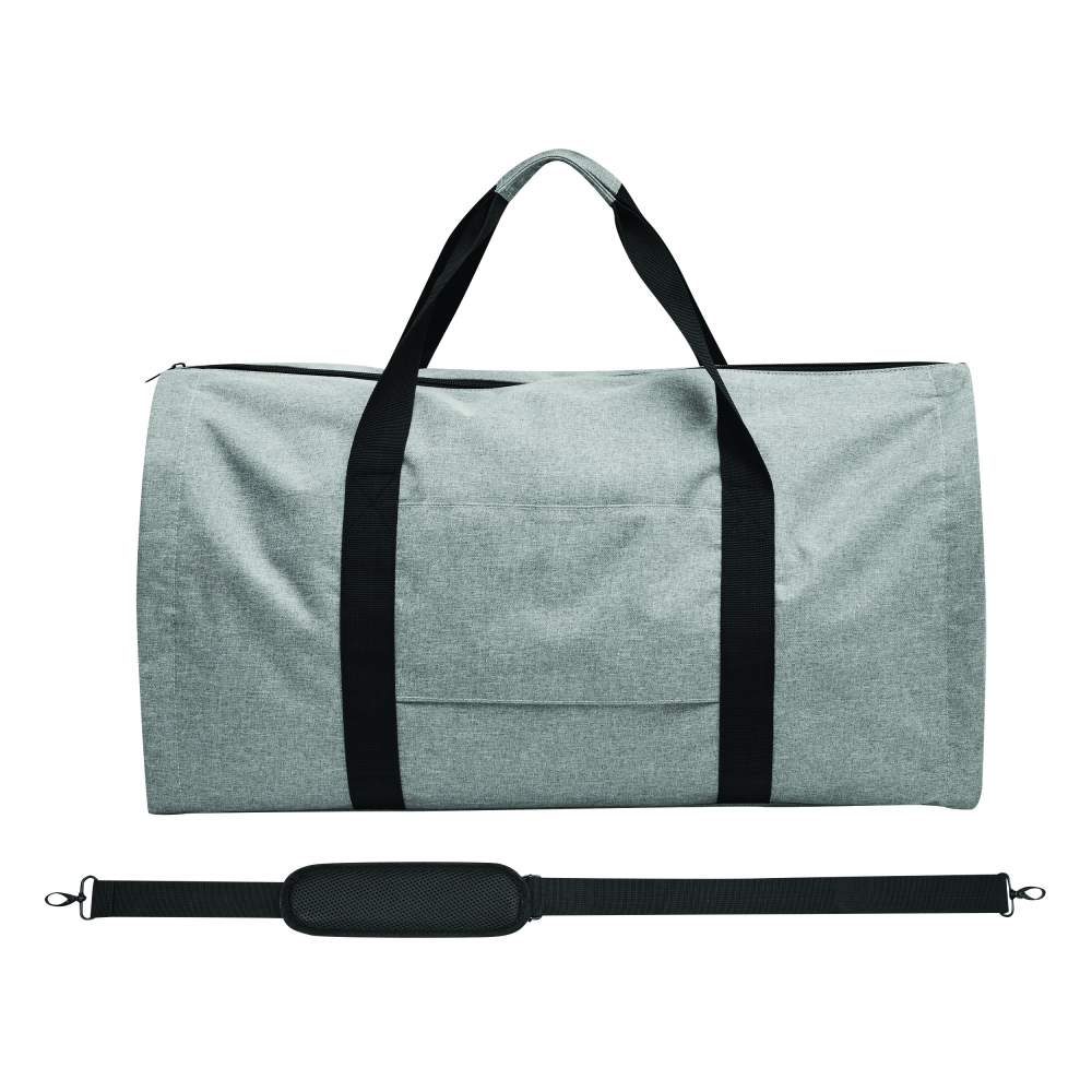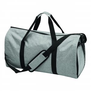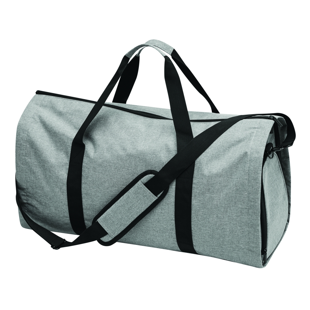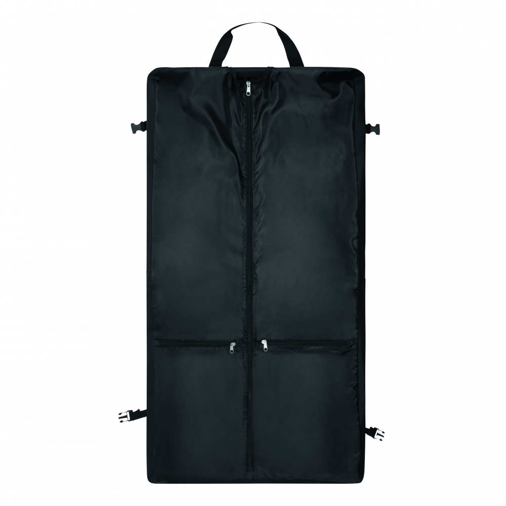 Großer strapazierfähiger Kleidersack aus festem Polyester mit Schulterriemen, Tragegriff, zusätzlichen Staufächern und dezentem Metallschild auf einem Label aus Kunstleder. Ihre Werbung lasern wir auf das Metallschild.