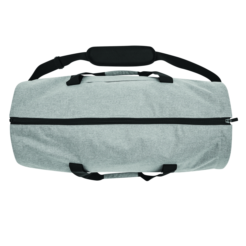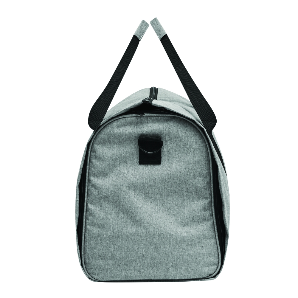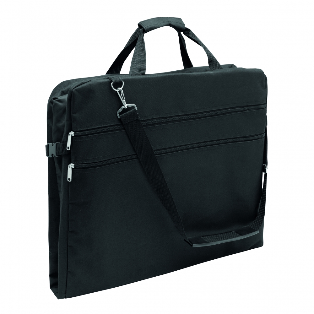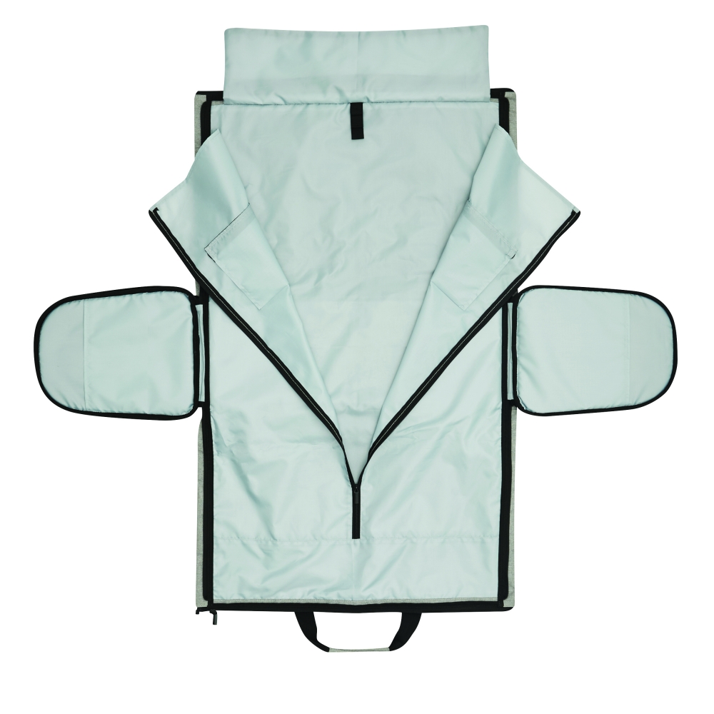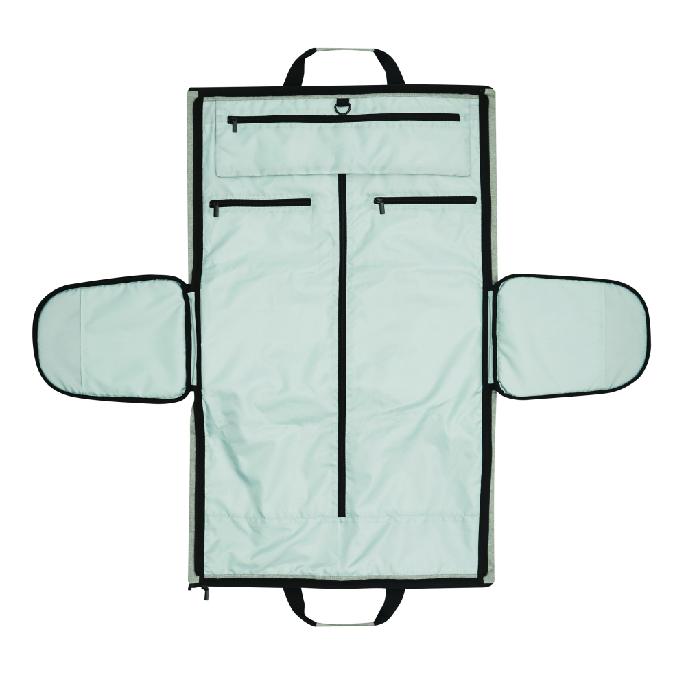 Großer strapazierfähiger Kleidersack aus festem Polyester mit Schulterriemen, Tragegriff, zusätzlichen Staufächern und dezentem Metallschild auf einem Label aus Kunstleder. Ihre Werbung lasern wir auf das Metallschild.