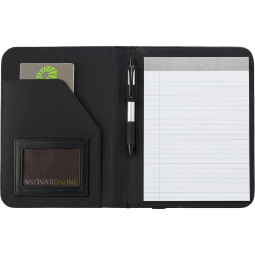 Konferenzmappe aus PU, ca. DIN A4-Format, mit 4 Einsteckfächern, Stifthalter (ohne Stift), Metallplätchen für Gravuren und Schreibblock mit 25 linierten Blättern.