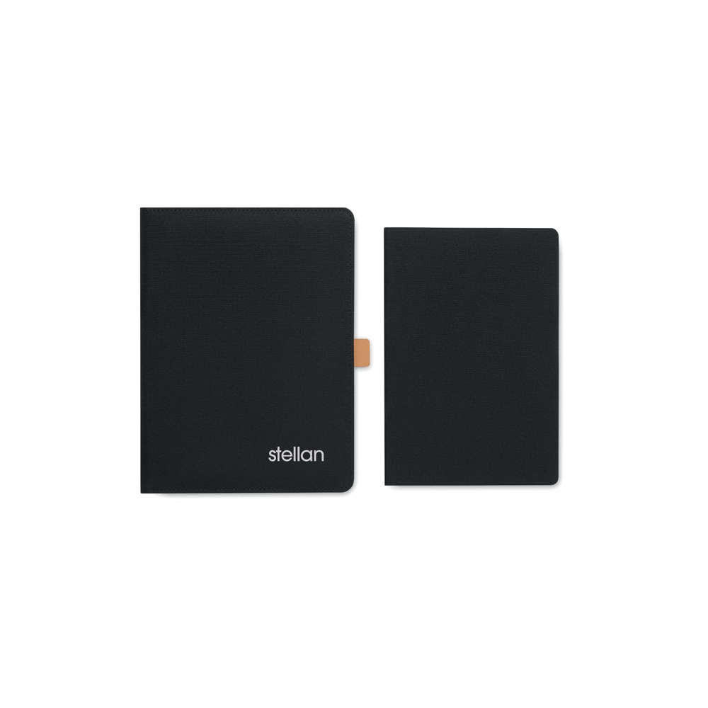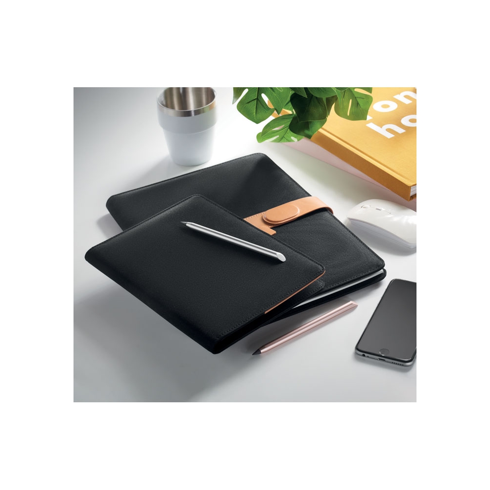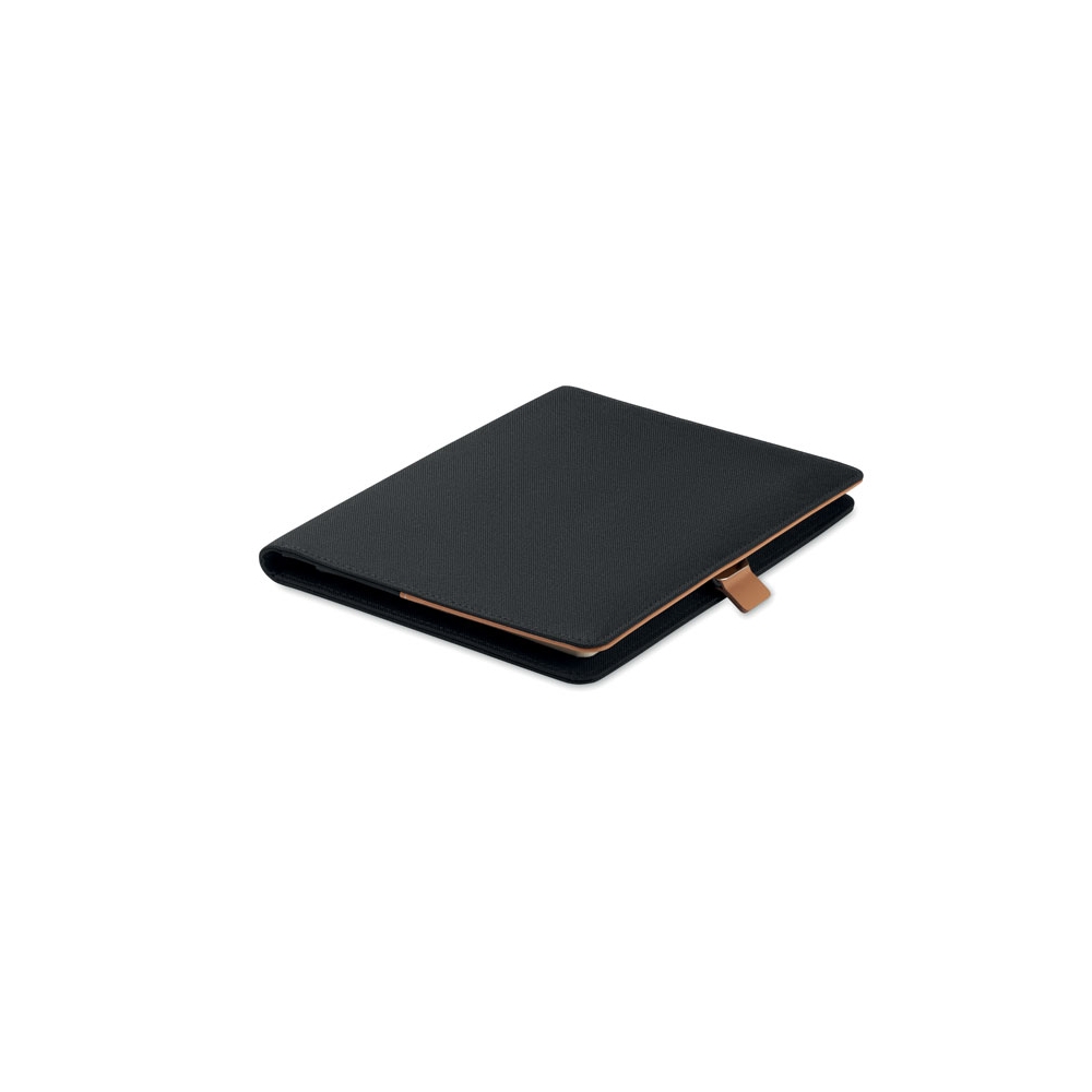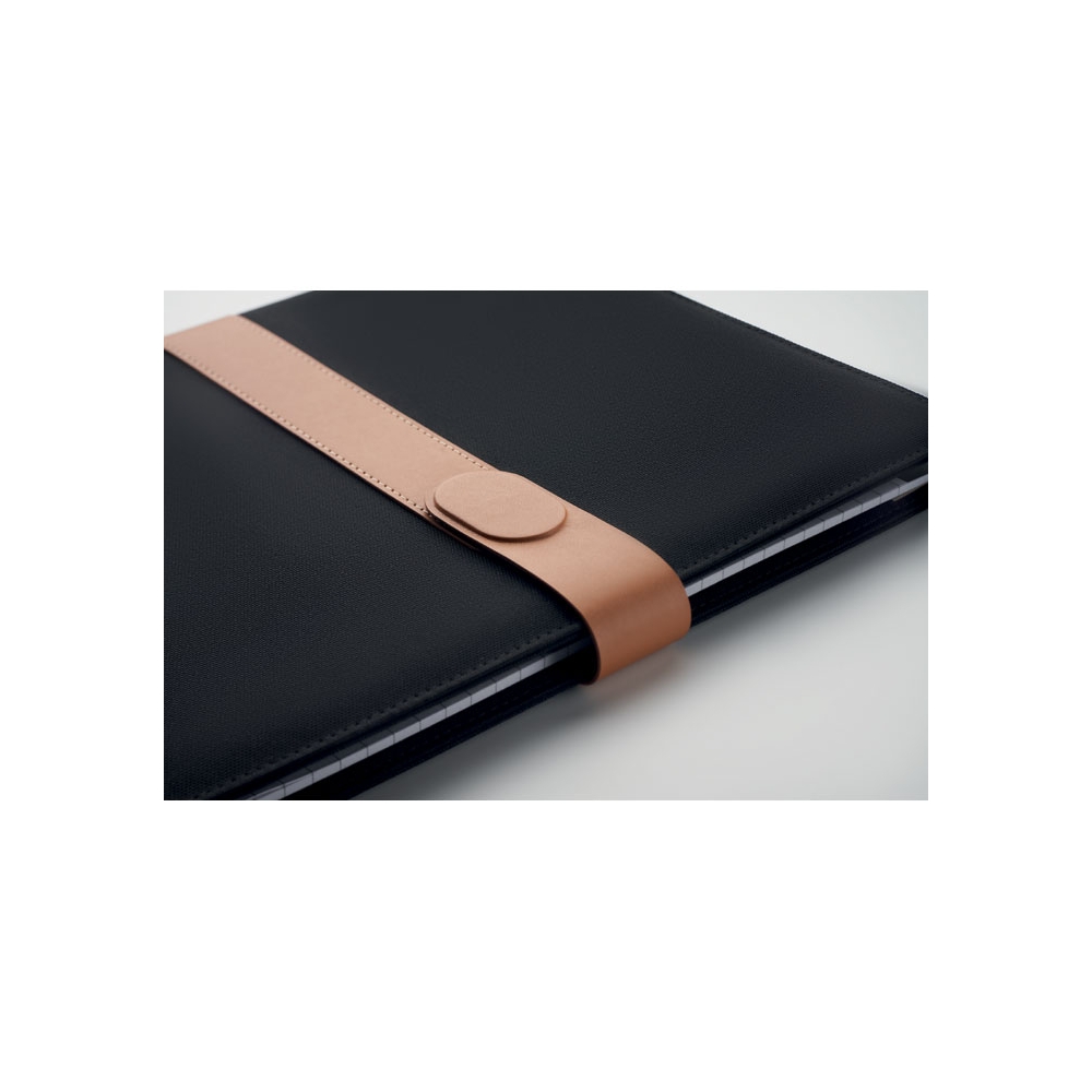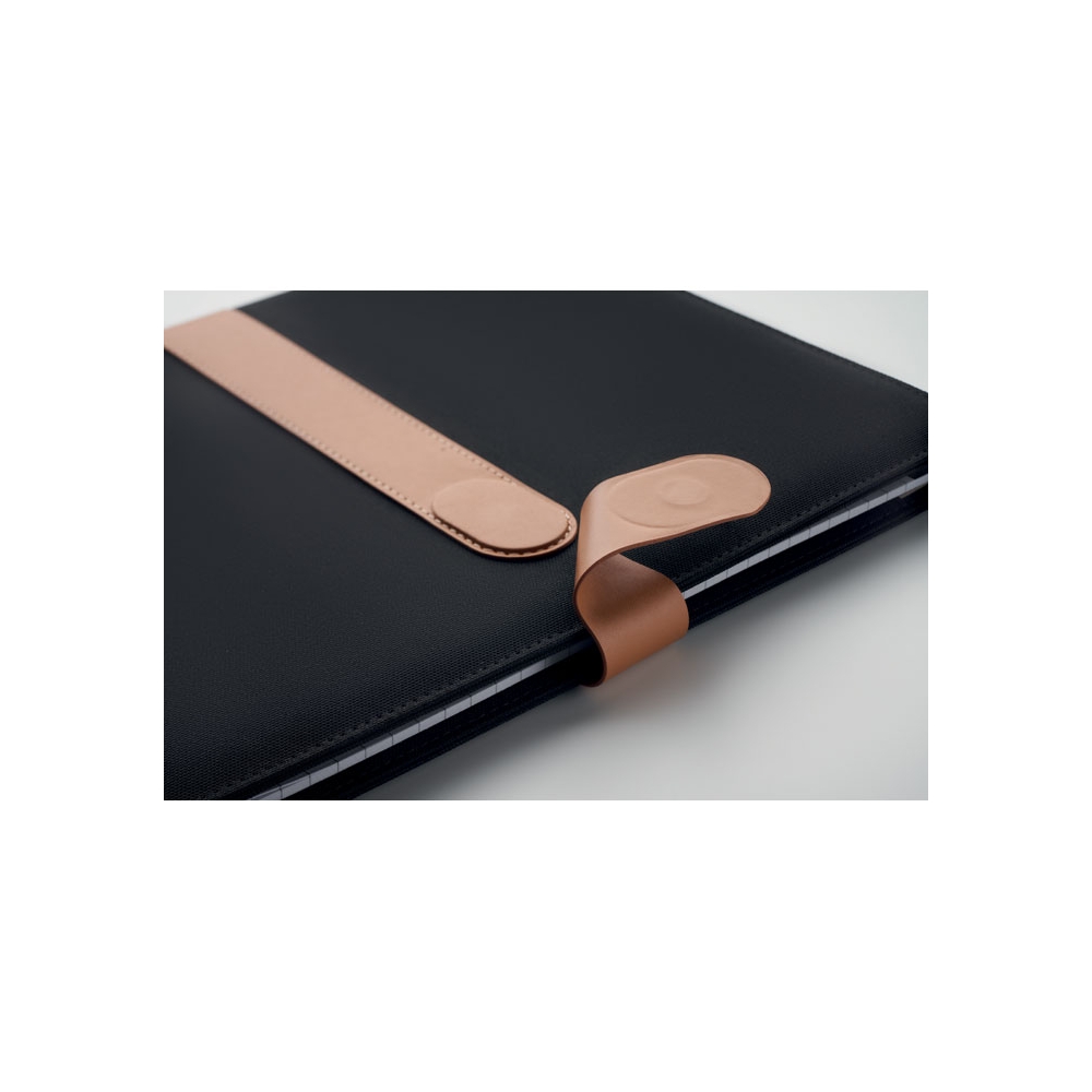 DIN A5 Mappe aus RPET mit Details aus Kunstleder. Auswechselbares A5-Notizbuch mit gebundenem Hard Cover. 64 Blatt (128 Seiten) liniertes Recyclingpapier. Stifthalter, 2 Kartenfächer und ein großes Fach. Elastisches Verschlussband mit Dekor aus Metall. FSC®-certified | FSC MIX, P8.6, FSC-C213206