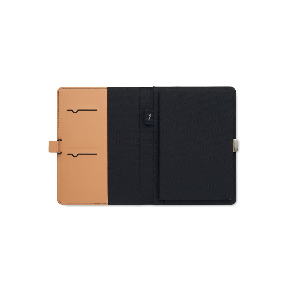 Konferenzmappe aus Kork, ca. DIN A4-Format, mit 3 Einsteckfächern, Stifthalter, inklusive Verschlussband und Schreibblock (20 linierte Blätter, etwas kleiner als DIN A4 Format).