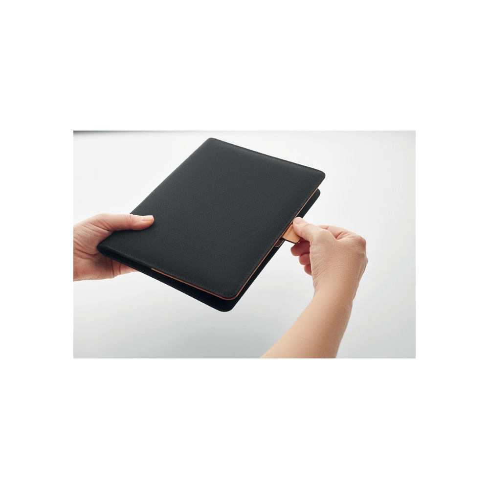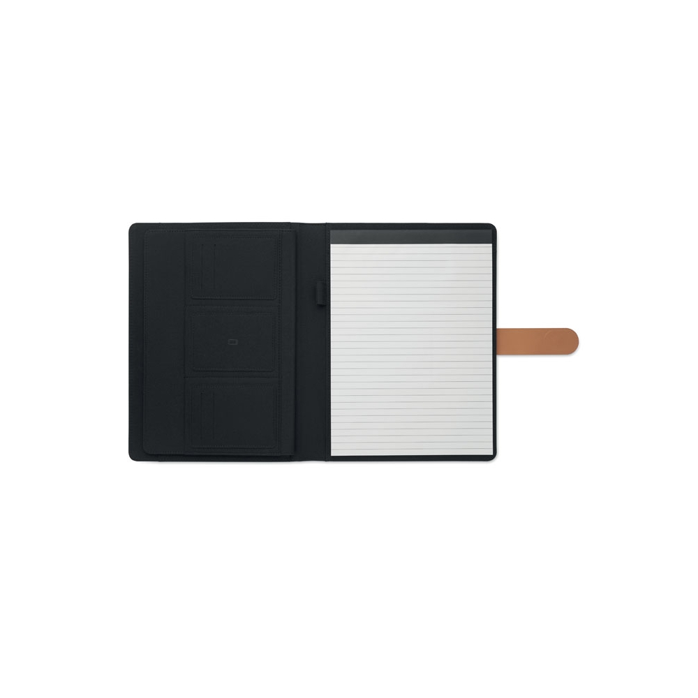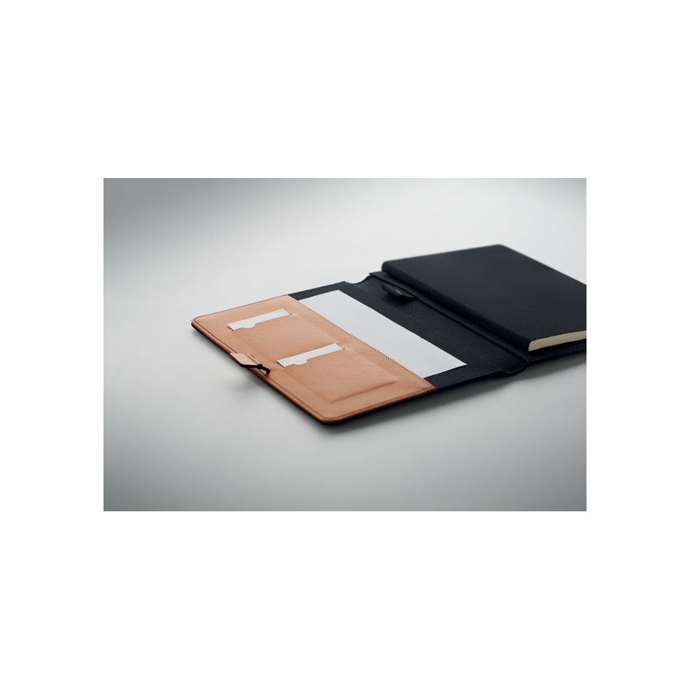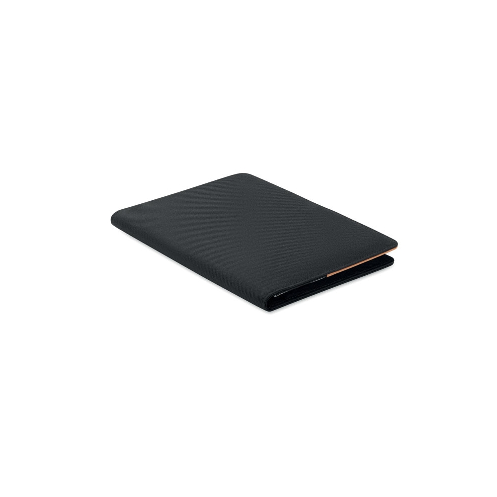 DIN A4 Mappe aus RPET mit Details aus Kunstleder. Auswechselbares A4- Notizbuch mit gebundenem Hard Cover. 15 Blatt (30 Seiten) liniertes Recyclingpapier. Stifthalter, 4 Kartenfächer, 3 kleine und ein großes Fach. Magnetischer Verschluss. FSC®-certified | FSC MIX , P8.6, FSC-C213206