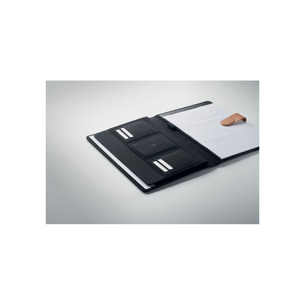 DIN A4 Konferenzmappe mit Cover aus Leinen und PU. Notizblock mit 20 Blatt liniertem Papier, diversen Innenfächern, Stiftschlaufe, 5000 mAh Powerbank und 15W magnetisches kabelloses Ladegerät. Magnetischer Verschluss.