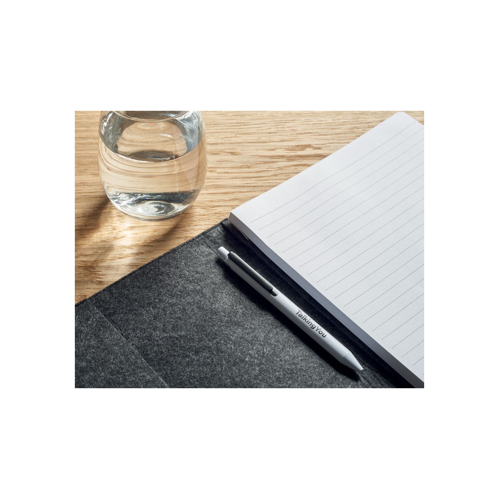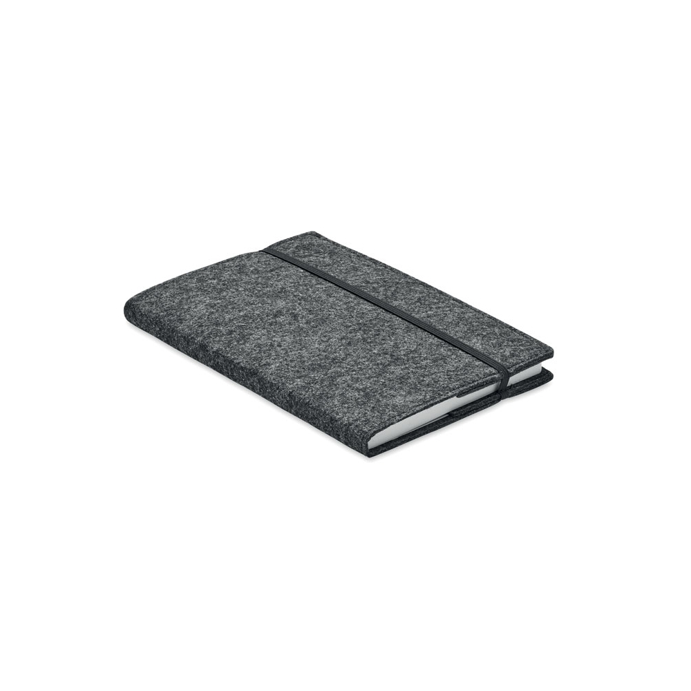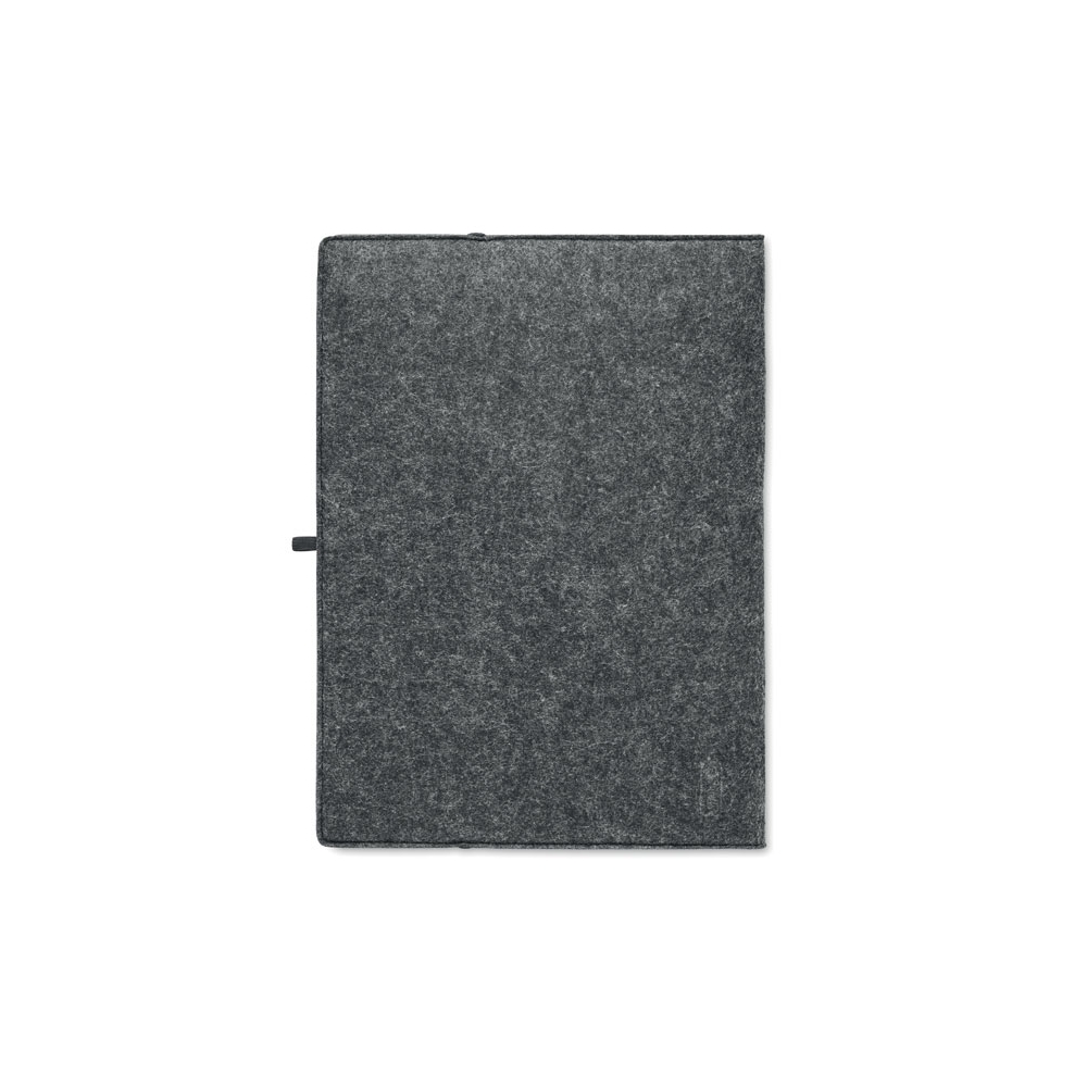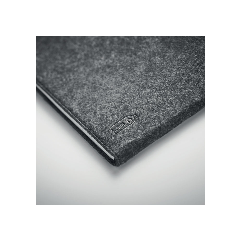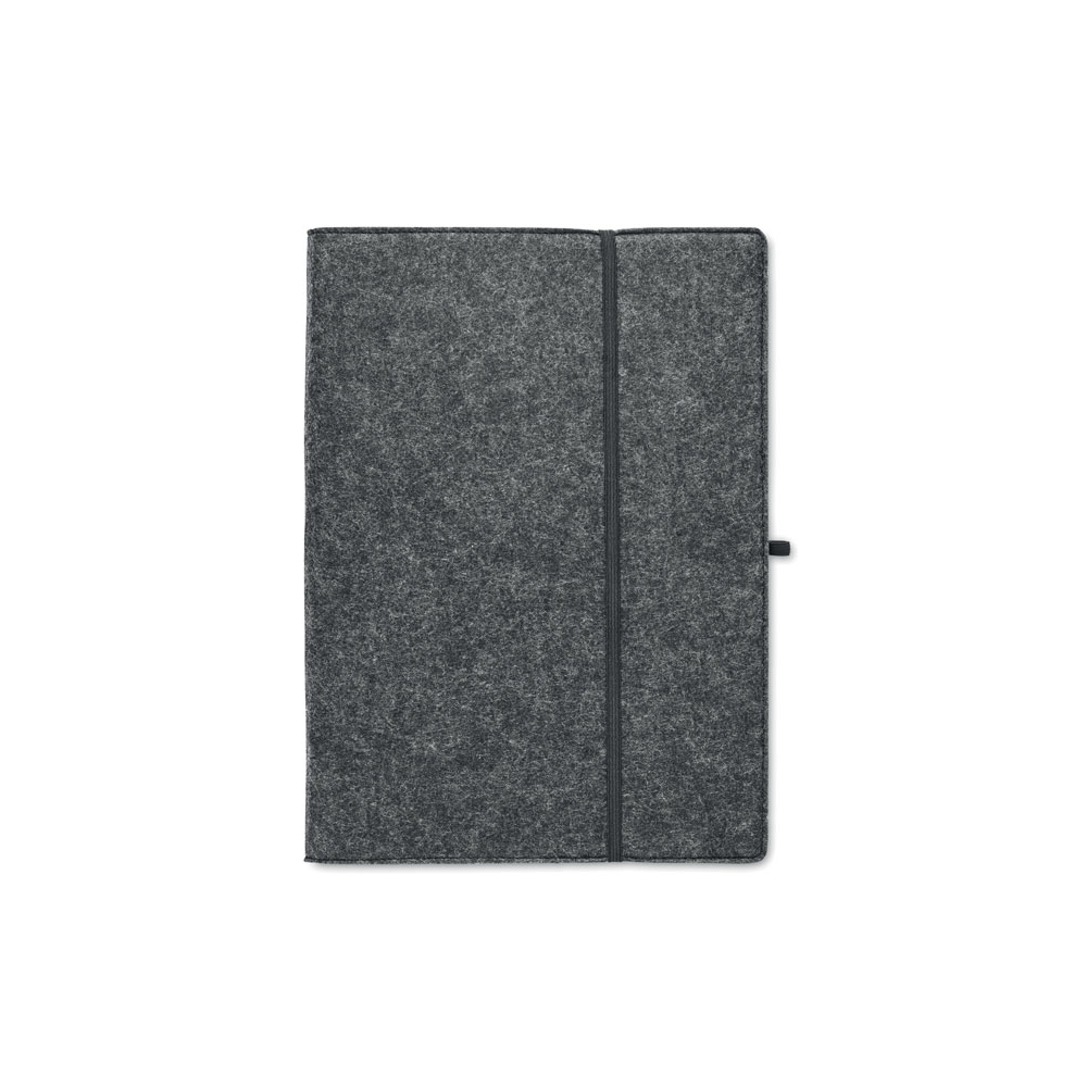 DIN A4 Konferenzmappe aus RPET-Filz mit diversen Fächern. Notizblock mit 100 Blatt (200 Seiten) liniertem Recyclingpapier. Elastische Stiftschlaufe.