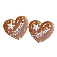 Filigran ausdekorierte Lebkuchenherzen aus Honiglebkuchenteig. Dekoration und Farben richten wir nach Kundenwunsch. Größe: ca. 7 cm, Gewicht: ca. 15 g Verpackung: Einzeln in Glanzbeutel aufgebunden. Haltbarkeit: 6 Monate