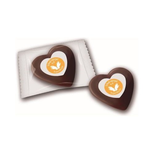 Mit Zartbitterschokolade überzogen und mit farbig gedrucktem Marzipan-Fondantlogo in Herzform versehen. Gewicht: ca. 16g Verpackung: Einzeln in Glanzfolie per Flowpack verpackt. Haltbarkeit: 3 Monate