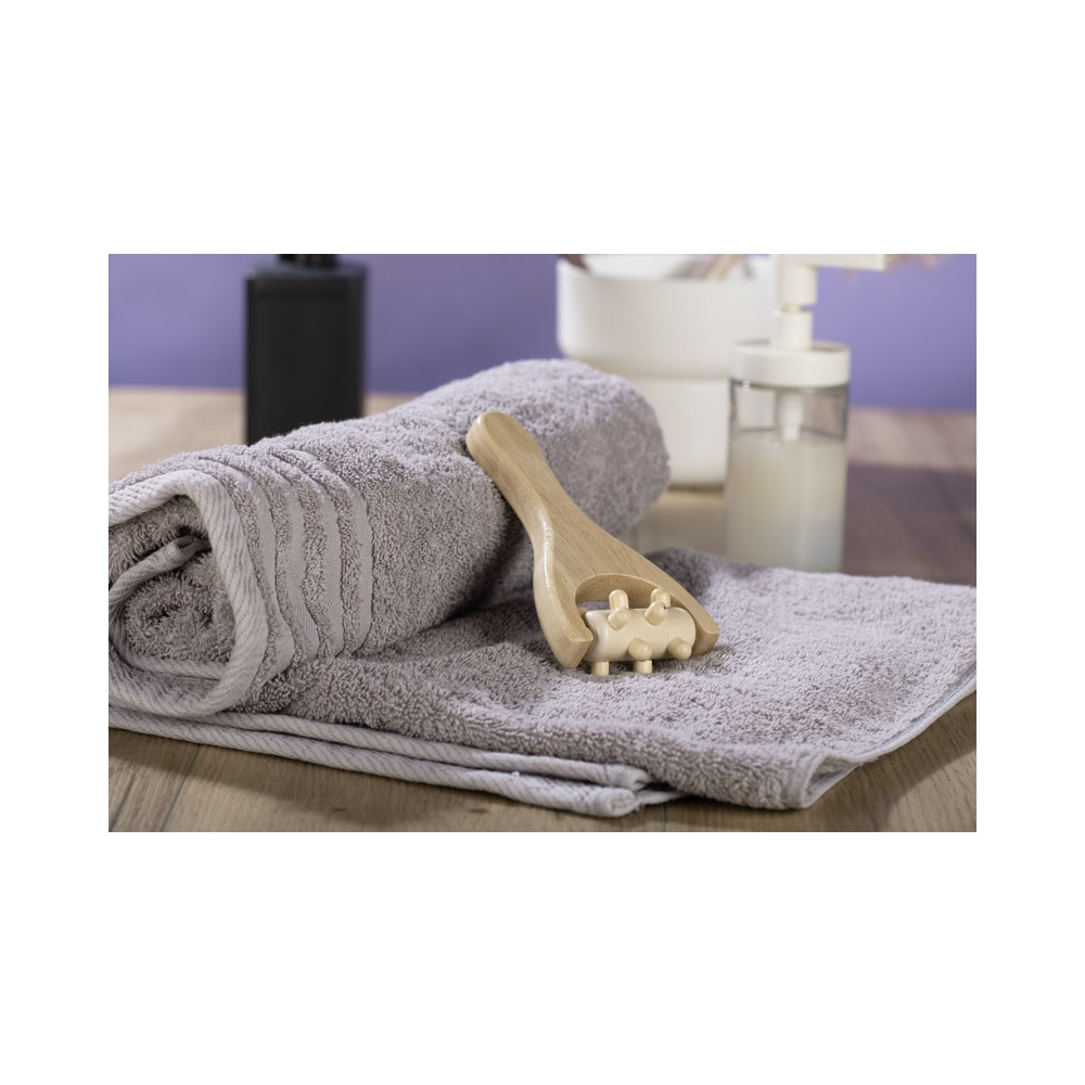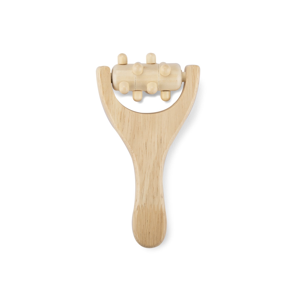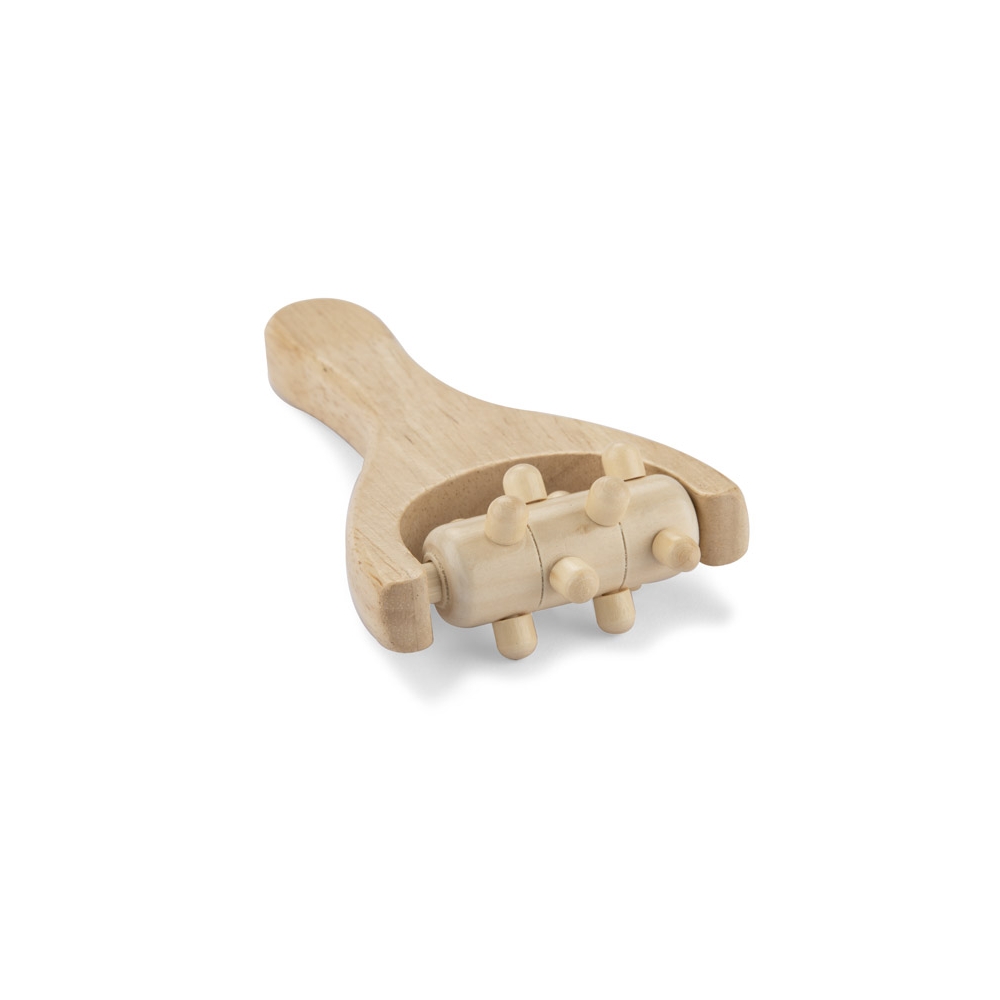 Massagegerät aus Naturholz. Entwickelt, um Linderung und Wohlbefinden zu bieten. Sein ergonomischer Griff sorgt für eine komfortable Handhabung, während seine drei Holzrollen effizient sind und für eine revitalisierende Massage sorgen, die Muskelverspannungen löst. Einzeln verpackt in einer Kraft-Design-Box.