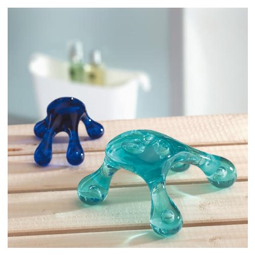 Massagegerät aus Metall in verschiedenen kräftigen Farben. Mit Beinen aus weichem Gummi.
